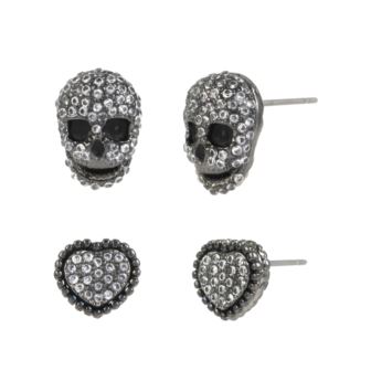 2 pair earrings pierced earrings. Pave heart studs set in hematite. Pave skull studs set in hematite.