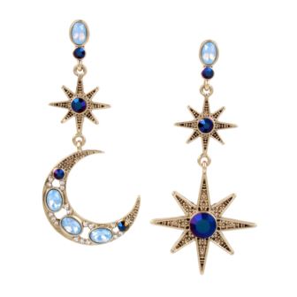 Gold tone mismatched star and moon earrings featuring a star and moon drop with navy blue and light blue stones and a double star drop earring featuring navy blue and light blue stones. Pierced with 2.5" drop.