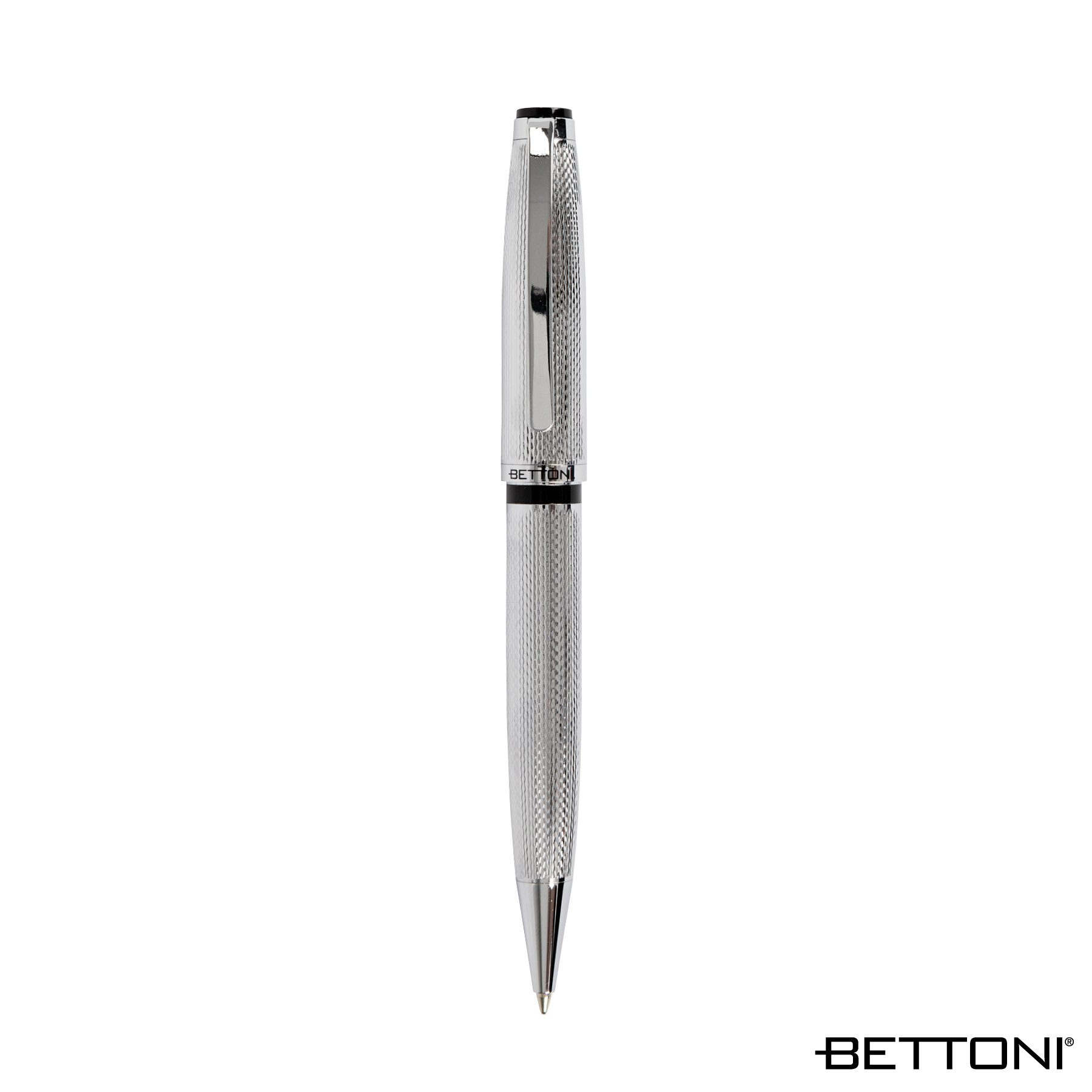 Experience the perfect blend of elegance and functionality with the Bettoni® Napoli Twist-Action Ballpoint Pen. Designed with sustainability in mind, this heavy-weight writing instrument is crafted from recycled brass and features a replaceable Made in USA black ink cartridge, allowing for long-lasting use and reducing waste. Its stunning chrome etched cap and barrel exude a sophisticated look that enhances any professional setting. Its sleek and stylish appearance and well balanced grip, makes it an ideal choice for business meetings, signing important documents, or as a thoughtful gift for any executive.