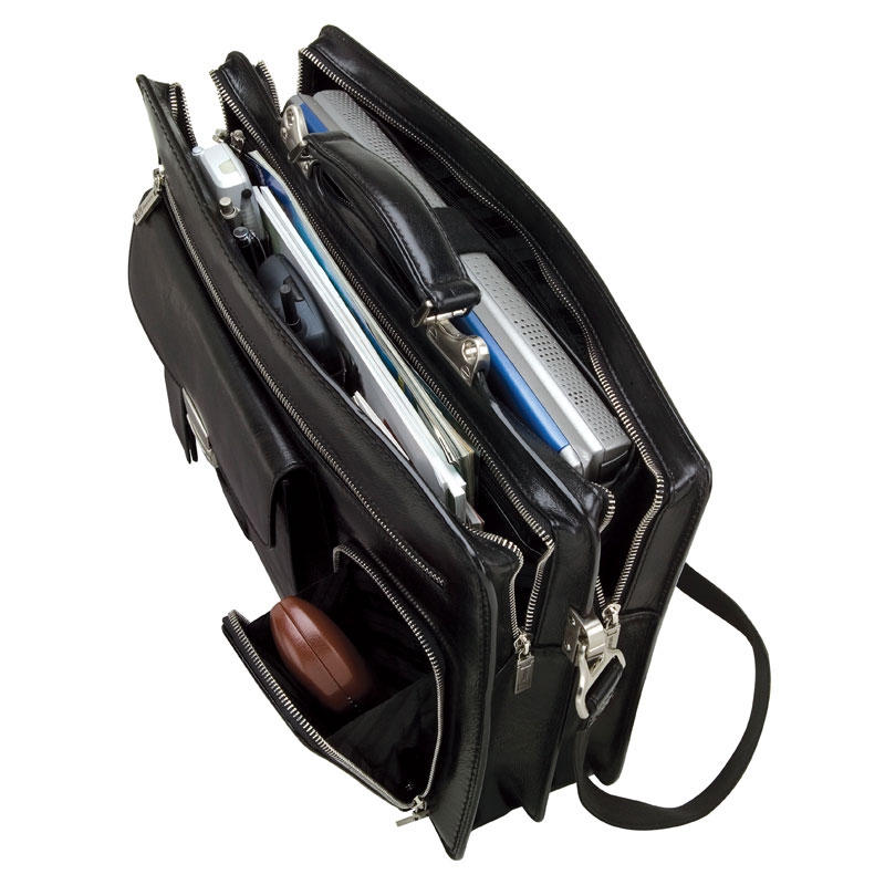 Slick full grain leather gusseted briefcase, 2 zip compartments with removable laptop holder, multiple accessory holders, adjustable shoulder strap, removable trolley strap, 3 exterior zip pocket & gusseted buckle closure pocket.