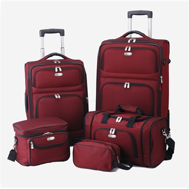 Bob Mackie Hollywood Collection 5 Piece Set consist of: 20" Expandable Carry-On Cart - (Dims: 20" x 14" x 8" x 25") , 25" Expandable Vertical Pullman (Dims: 25" x 16" x 9") , Expandable Shoulder Tote (Dims: 14" x 11 1/2 " x 6/12") , Women's Deluxe Cosmetic Case – (Dims: 12" x 8 1/2" x 7 1/2") , and Toilet Kit - (Dims: 10" x 5" x 4").