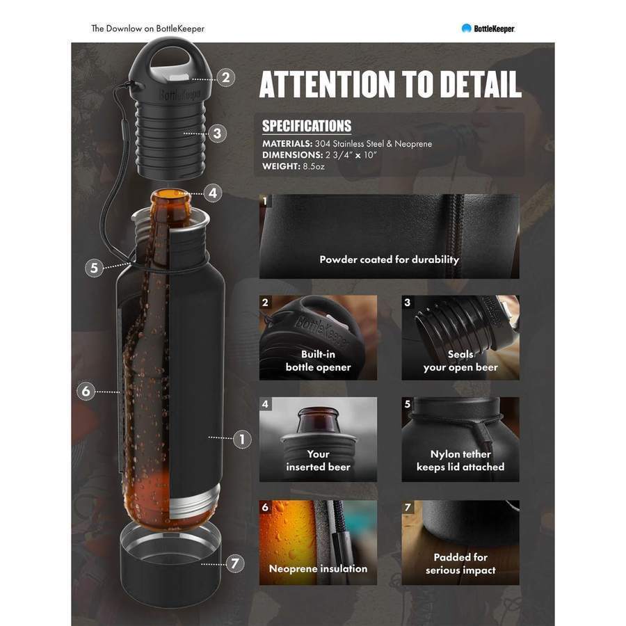 The BottleKeeper Standard 2.0 is perfect for insulating your glass bottle while protecting it from breaking. Constructed with durable stainless steel with a powder-coated finish, this bottle features a lid with a built-in bottle opener and a padded, shock-absorbing base to keep glass bottles safe and secure. Fits most standard sized 12oz glass beer and soda bottles. Recommended to hand wash only.