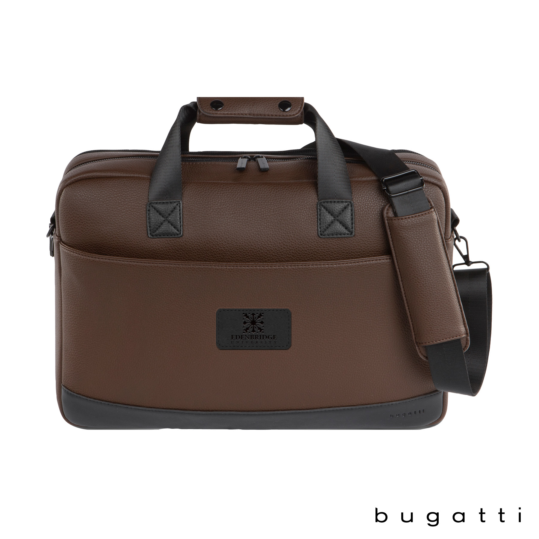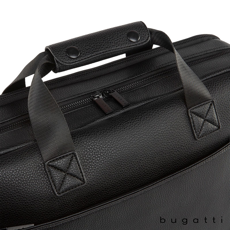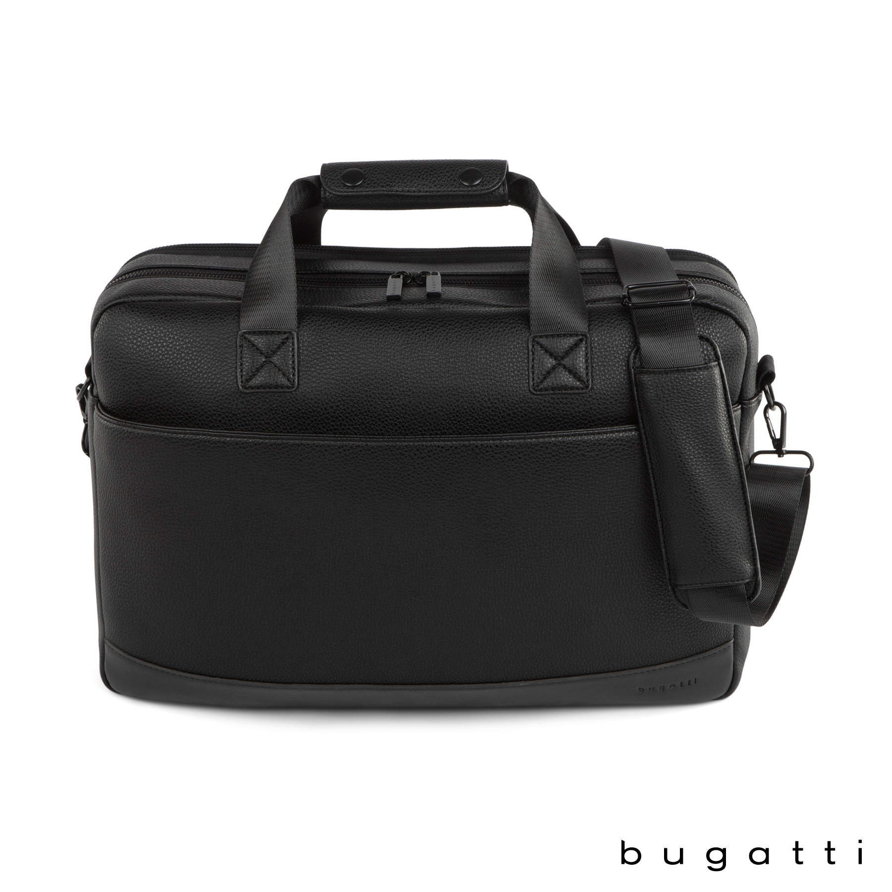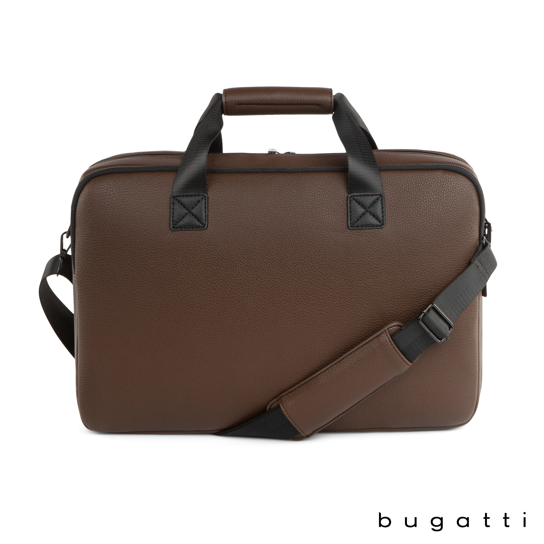 The Central Collection Briefcase from Bugatti combines traditional styling with modern day functionality to help keep you comfortable and organized all day. This textured vegan leather briefcase has a large, fully lined zippered main compartment with organizer panel and a zippered pocket and a backside zippered compartment to hold tablet or laptop up to 15.6". The Central Briefcase also features a zippered front pocket, reinforced carry handles and an adjustable and removable strap with shoulder pad for carrying over the shoulder or crossbody. This bag comes with Bugatti zipper pullers and a one-year limited warranty. Please note that smaller font lettering may not deboss legibly on the textured finish.