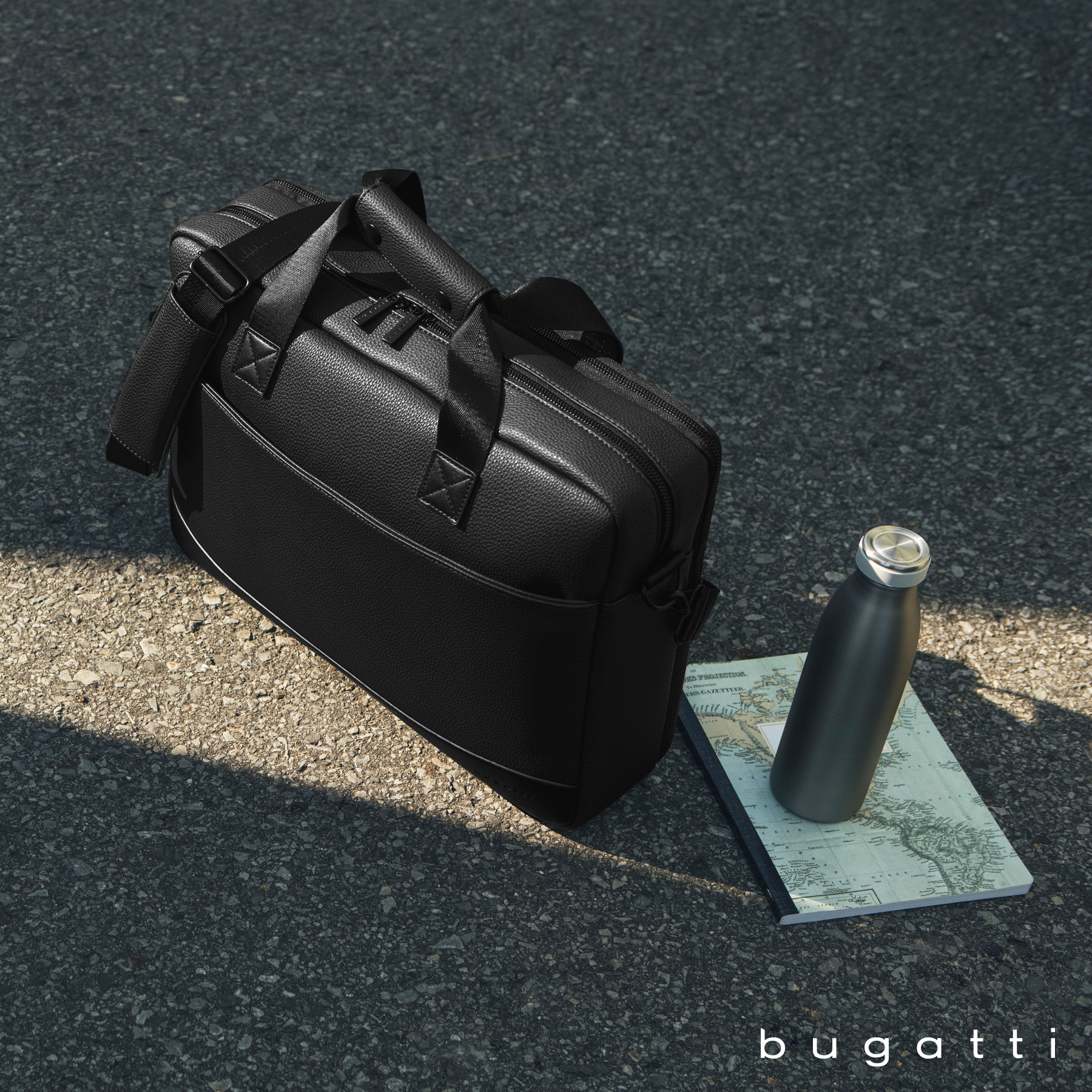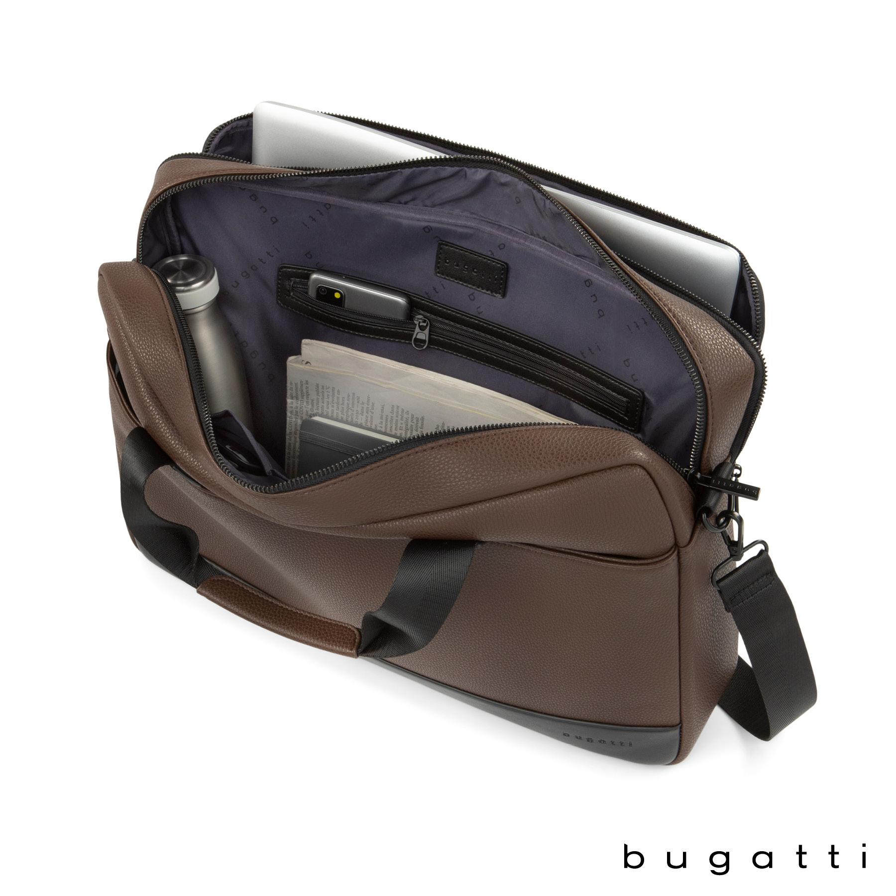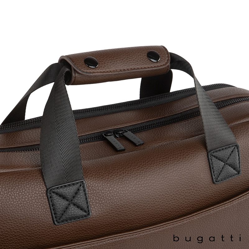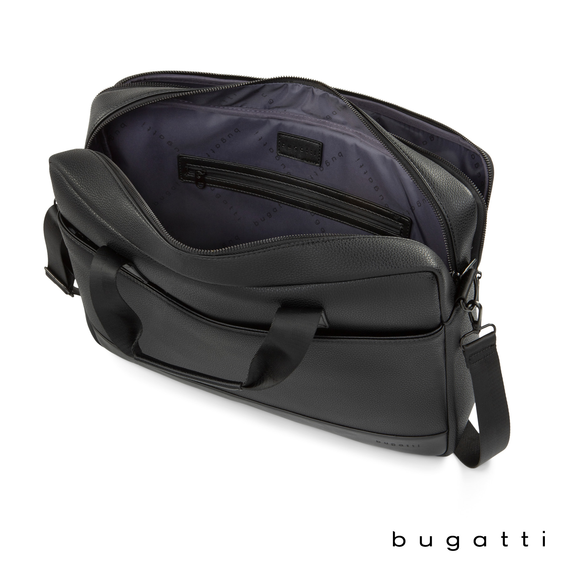 The Central Collection Briefcase from Bugatti combines traditional styling with modern day functionality to help keep you comfortable and organized all day. This textured vegan leather briefcase has a large, fully lined zippered main compartment with organizer panel and a zippered pocket and a backside zippered compartment to hold tablet or laptop up to 15.6". The Central Briefcase also features a zippered front pocket, reinforced carry handles and an adjustable and removable strap with shoulder pad for carrying over the shoulder or crossbody. This bag comes with Bugatti zipper pullers and a one-year limited warranty. Please note that smaller font lettering may not deboss legibly on the textured finish.