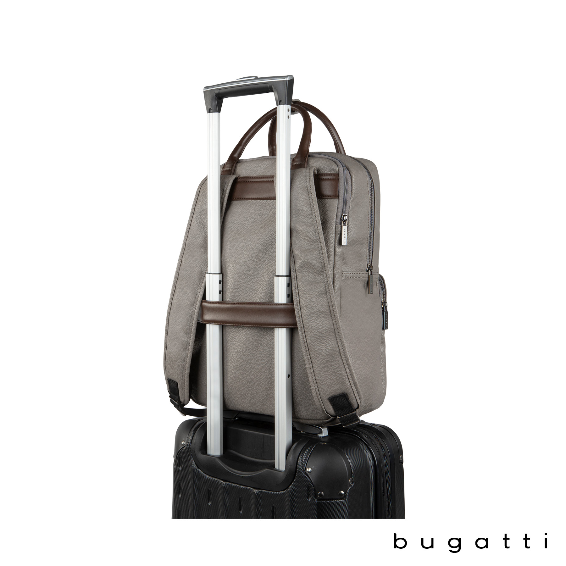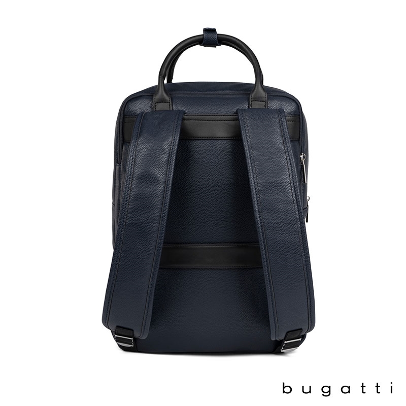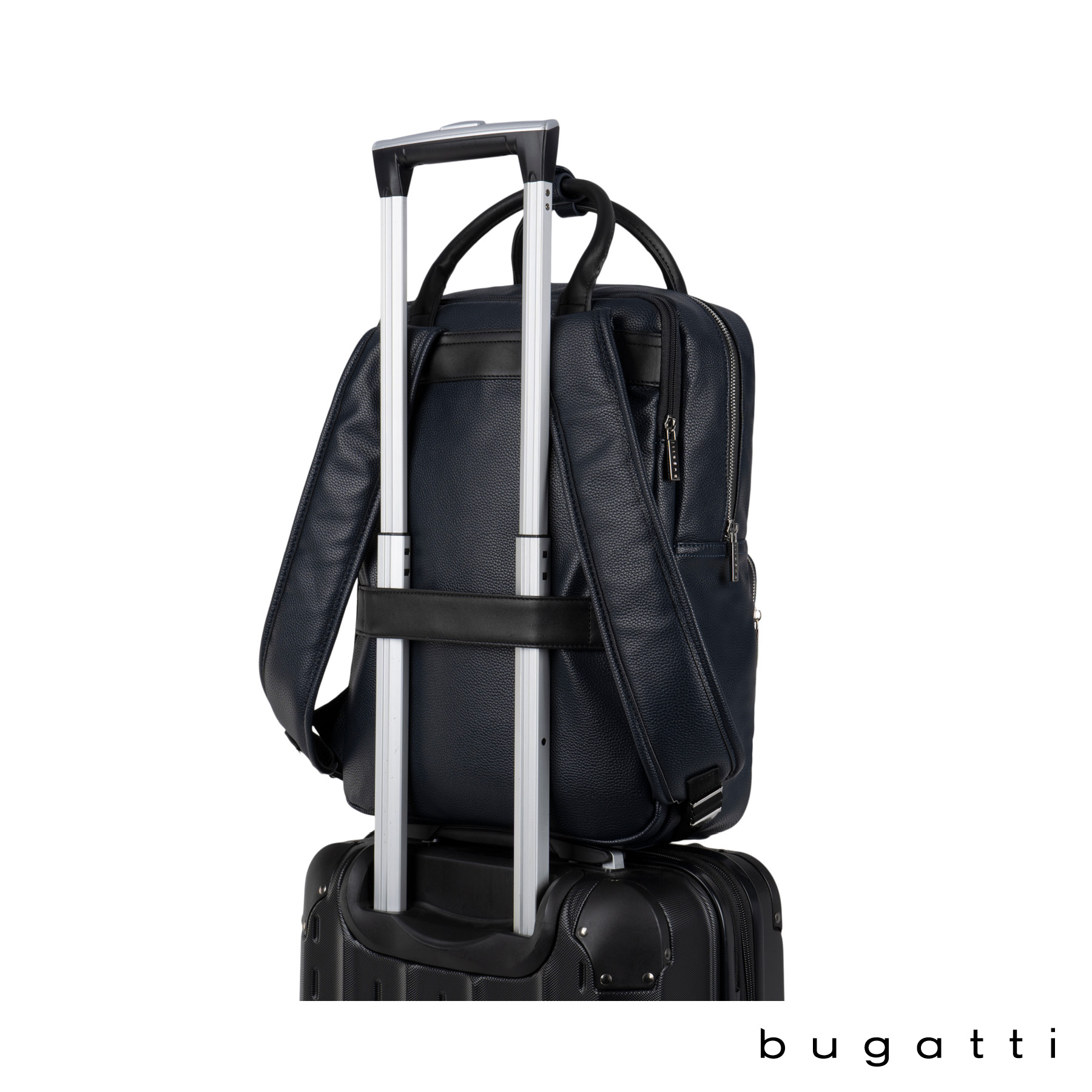 Travel with your belongings comfortably and in style with the Bugatti Contrast Collection Backpack. Made of durable pebble grain vegan leather, choose from wearing the bag as a backpack with its padded adjustable shoulder straps or carrying the bag by its reinforced handles. An exterior zippered pocket with built in organizers and a backside trolley pass-through strap make this backpack ideal for the frequent traveler. The backpack features a spacious zippered main compartment with a built in multi-use organizer for smaller items and a large zippered pocket for valuable as well as a padded and zippered backside pocket that will hold laptops up to 15.6". This backpack includes Bugatti zipper pulls and a two-year limited manufacturer warranty.