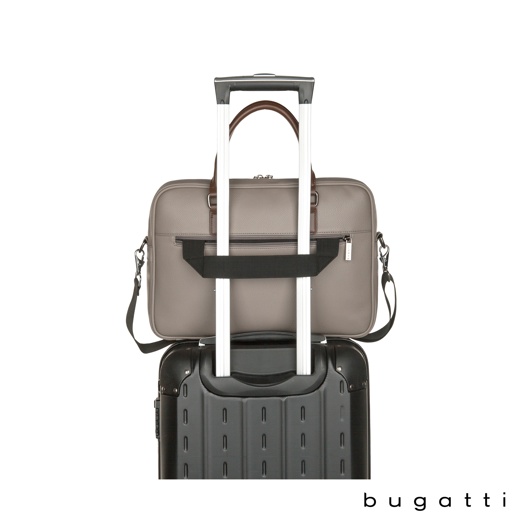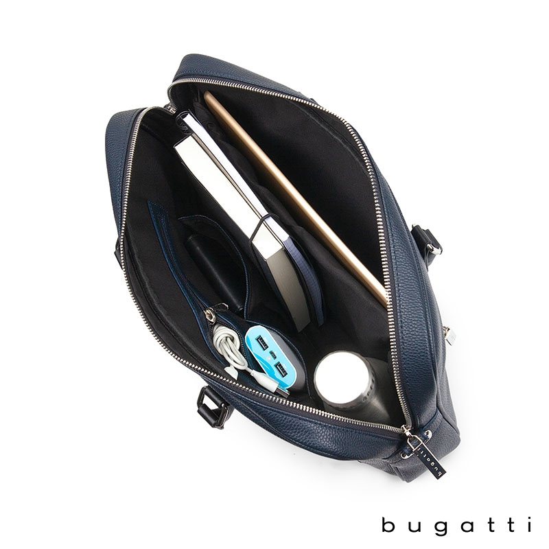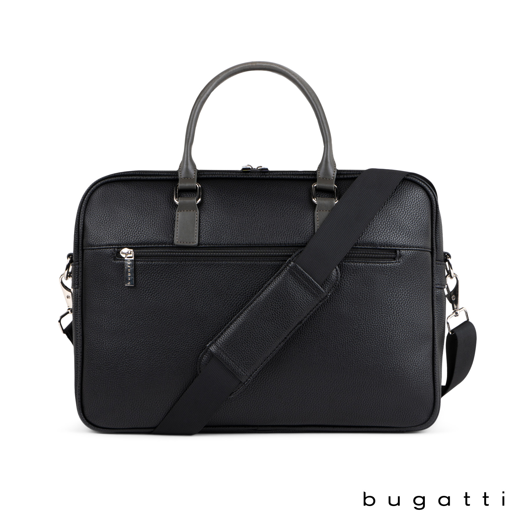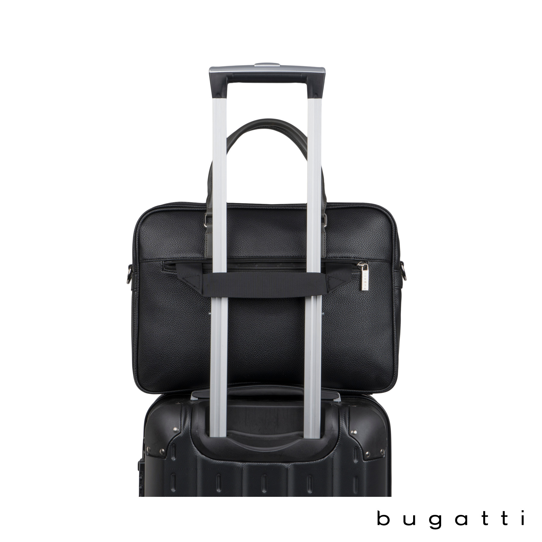 Enjoy your daily commute in style with the Bugatti Contrast Collection Briefcase. Made of durable pebble grain vegan leather and high quality hardware, this briefcase is designed to be the perfect everyday bag. Its reinforced handles, 1 1/2" x 48" adjustable and removable crossbody strap, and zippered exterior pocket with hideaway trolley pass-through strap make this briefcase the ultimate travel companion. The main zippered compartment features a padded laptop section that fits most laptops up to 14", a wide elastic bottle stabilizer, a multi-use built-in organizer for your smaller items and a large interior zippered pocket. This briefcase includes Bugatti zipper pulls and a two-year limited manufacturer warranty.