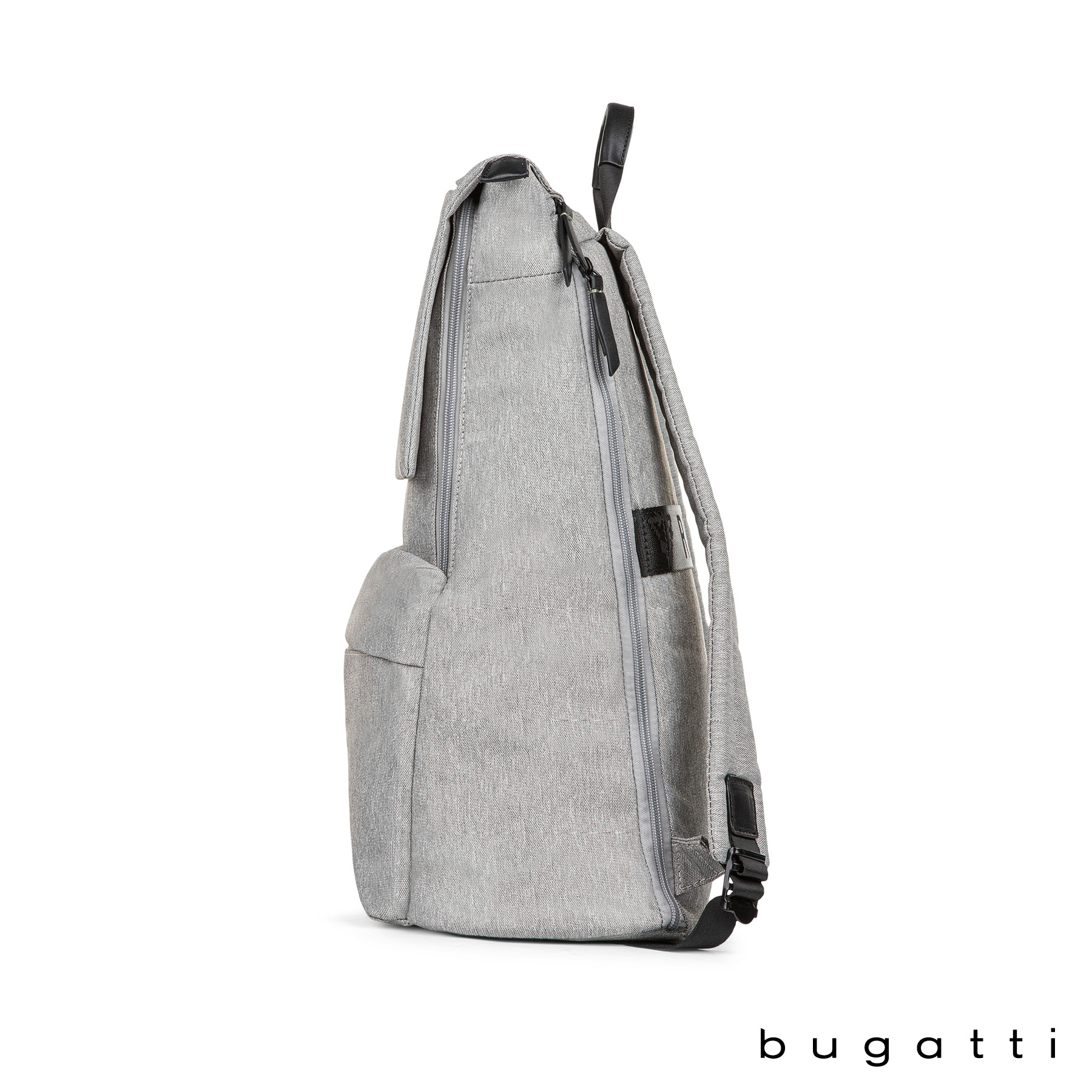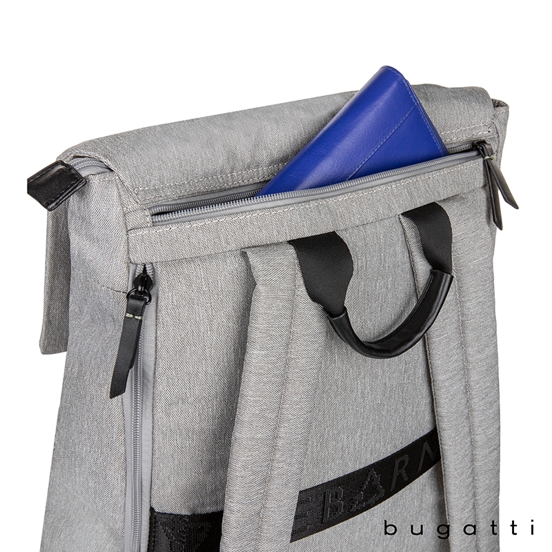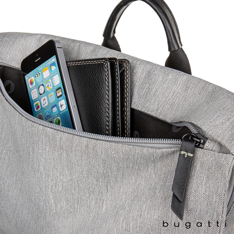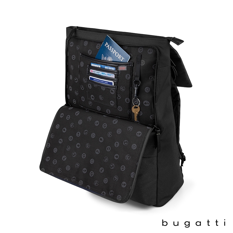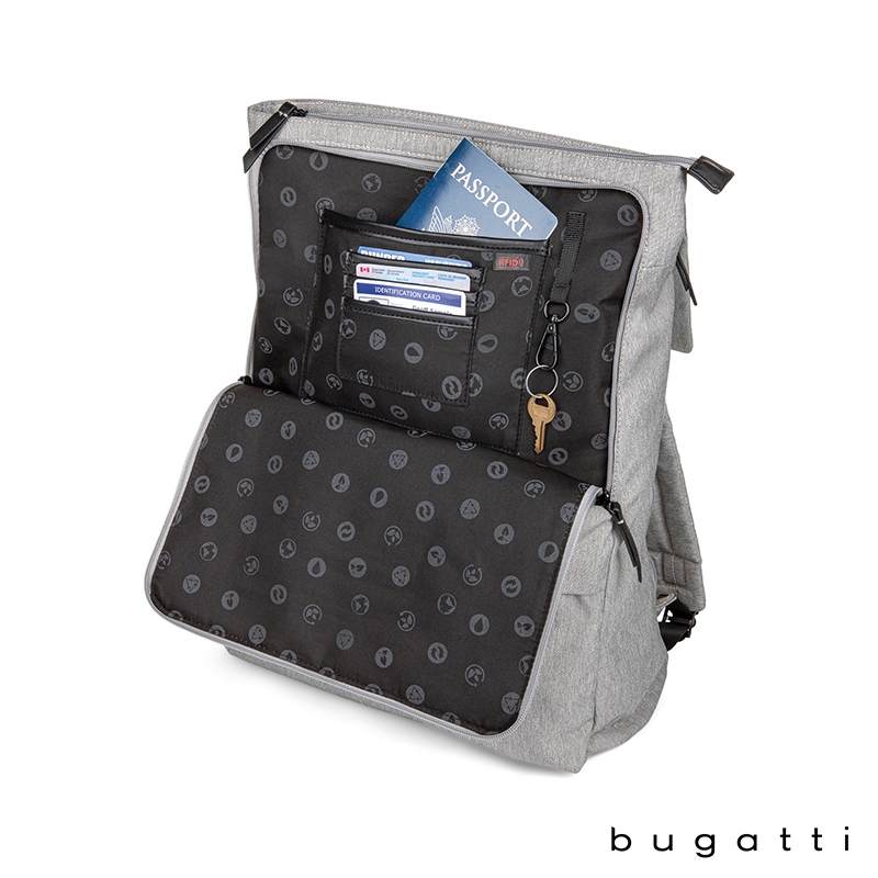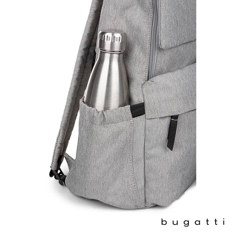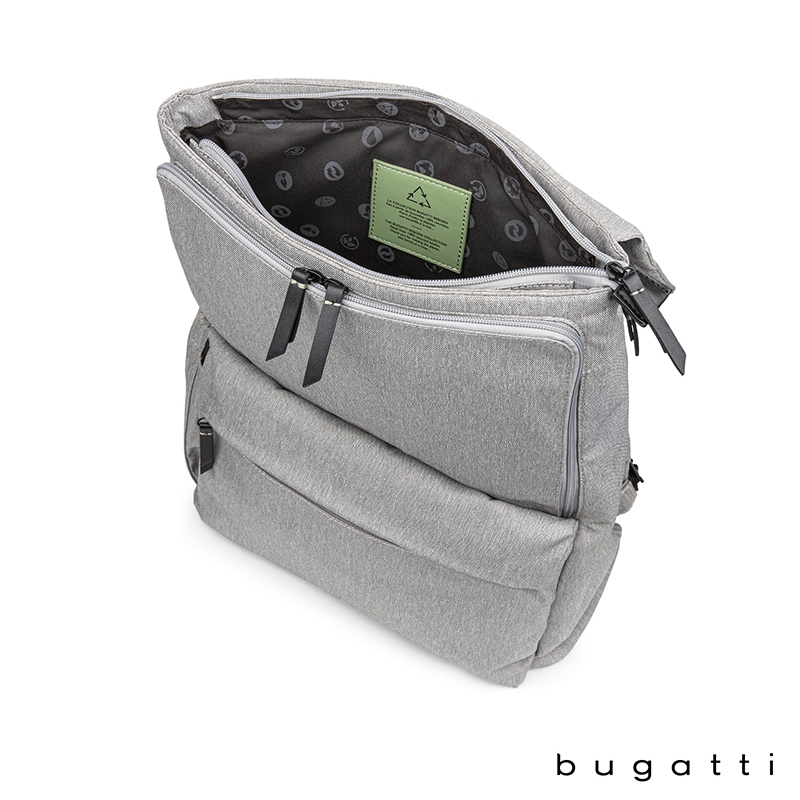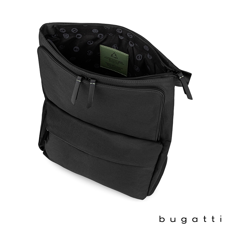 The Reborn Collection Backpack from Bugatti is lightweight yet durable and made from water-repellant recycled polyester. Packed with pockets, this bag made from recycled water bottles features a deep main compartment with padded pocket for your tablet, a zippered pocket and a top flap with zippered pocket. The exterior front pocket has a key leash and organizer section with RFID blocker pocket for your cards or passport and the lower front zippered pocket is perfect for your electronic accessories. There is a top side, easy-access zippered pocket, side zippered pocket that holds tablets or laptops up to 14" and a water bottle side pocket with elastic top. Carry the Reborn Backpack with the padded and adjustable backpack straps, top carry handle or attach it to your rolling luggage handle with the integrated trolley strap. This bag comes with Bugatti zipper pullers and a one-year limited warranty.