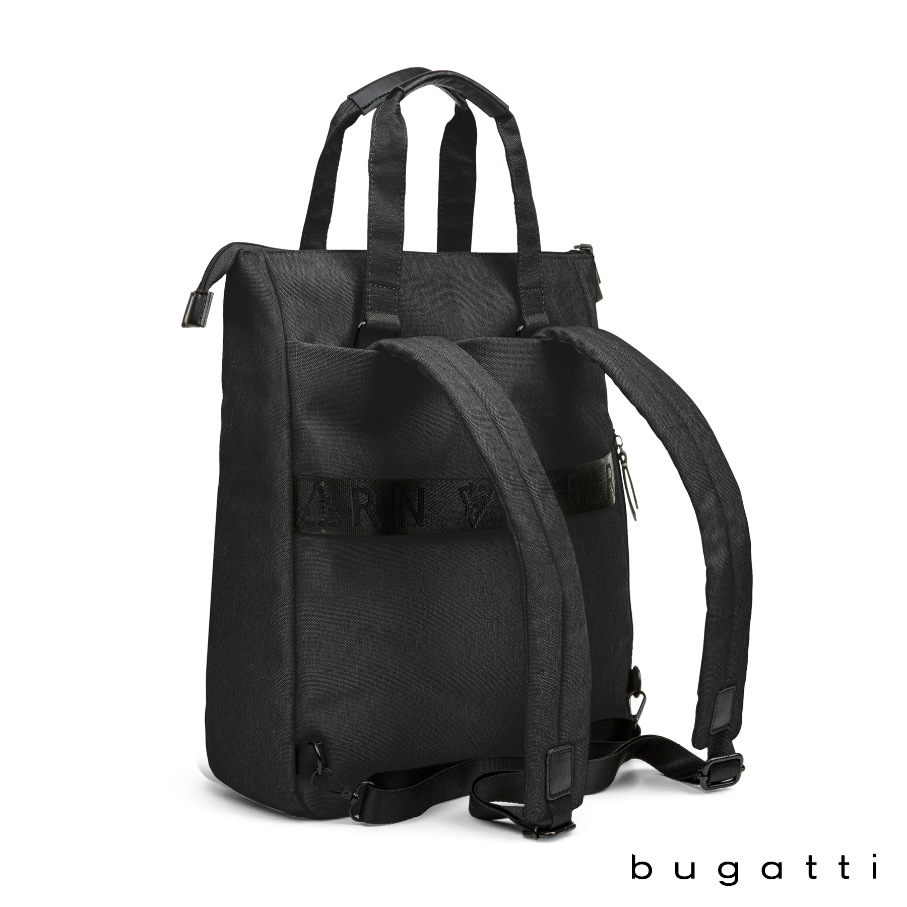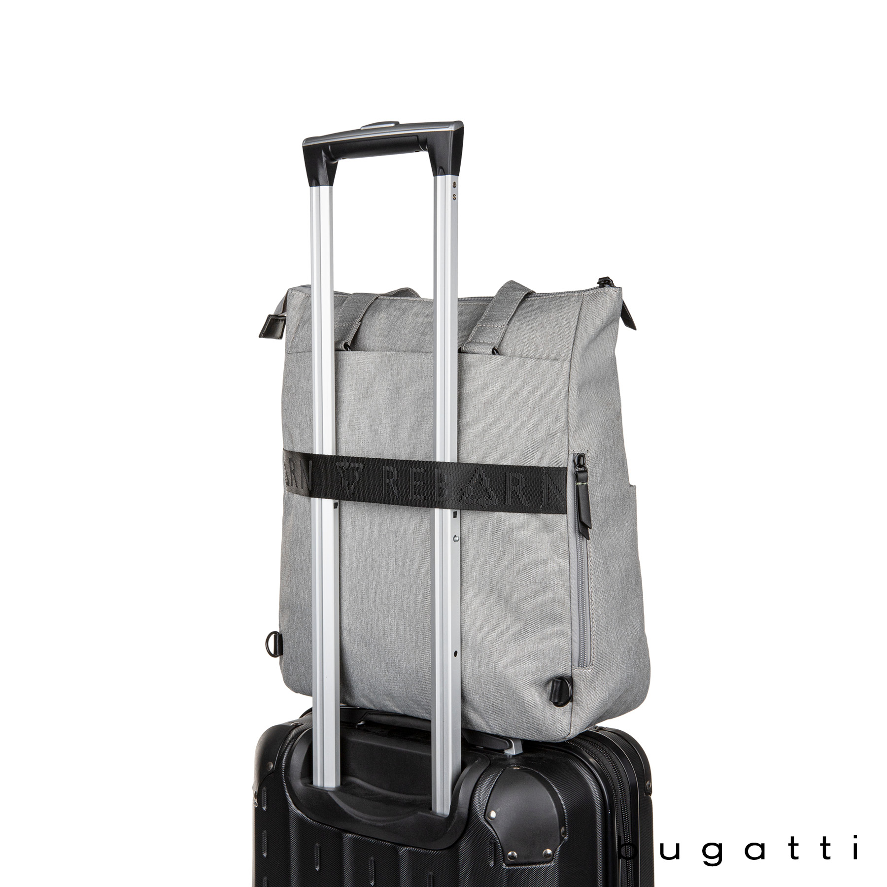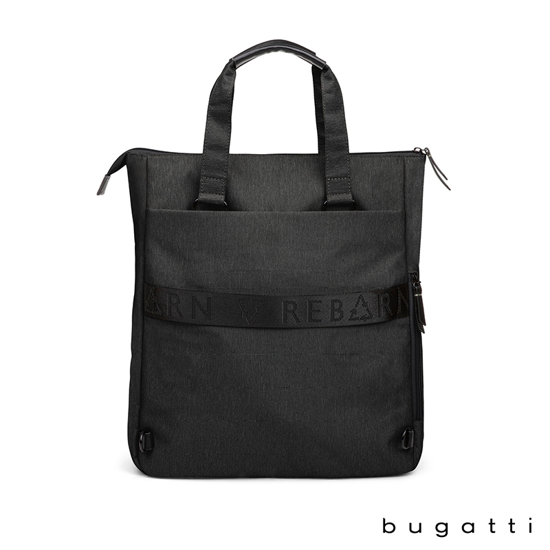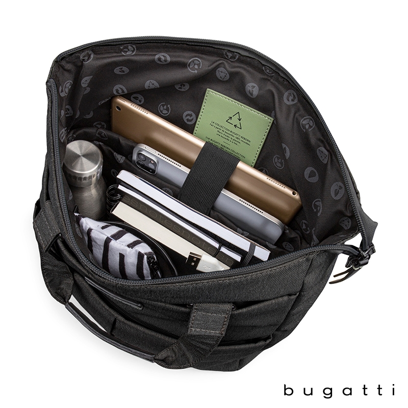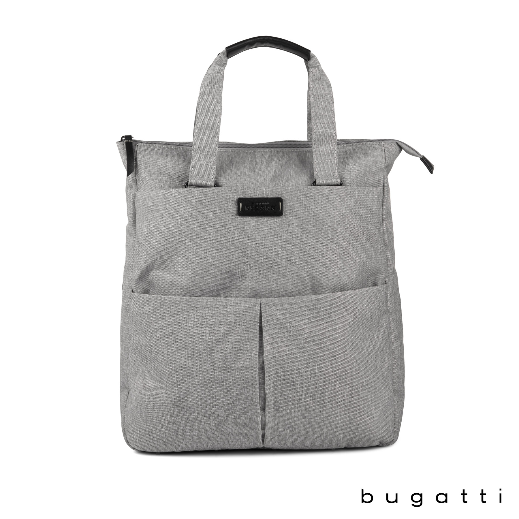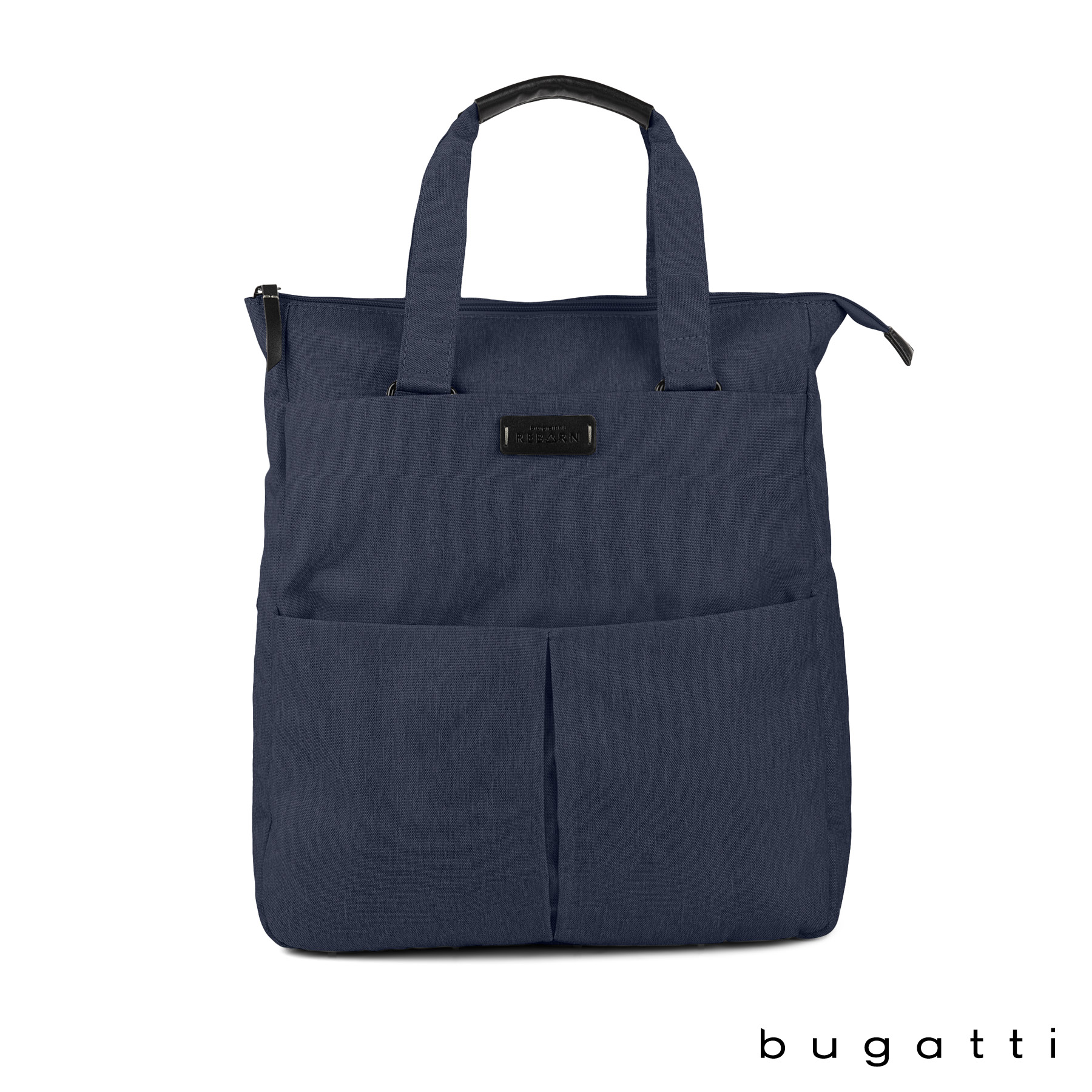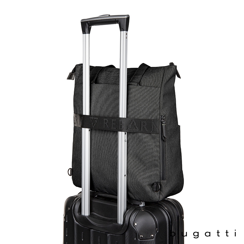 The Reborn Collection Hybrid Tote Bag from Bugatti is made of 100% recycled water-repellent polyester made from post-consumer water bottles (RPET). This lightweight 2-in-1 tote bag has reinforced carry handles and padded back straps that store inside a large backside slip pocket when not in use. It has a main compartment with an interior padded section that can fit most 15.6" laptops, an integrated key leash to easily locate your keys, a padded pocket that fits most tablets, an interior elastic strap to keep your water bottle in place, and an RFID protection pocket to keep your information secure from theft. The Reborn Tote Bag also has multiple exterior pockets and organizer sections, a trolley sleeve to easily slide the bag over your suitcase, and a hideaway zippered side pocket. In addition, this bag includes a one-year limited warranty.