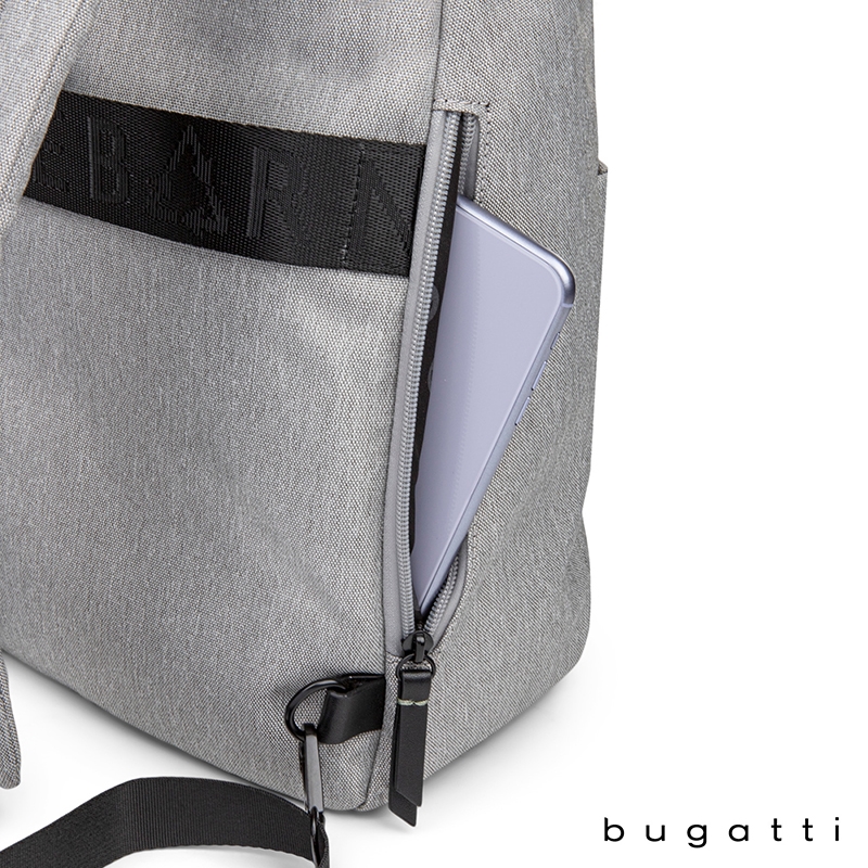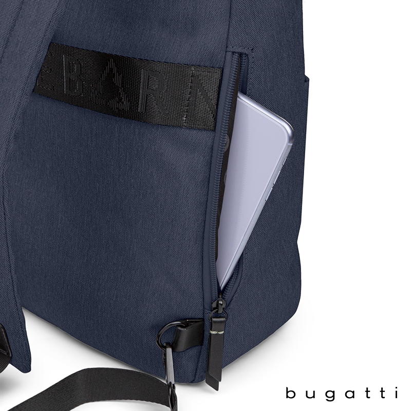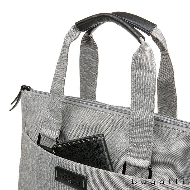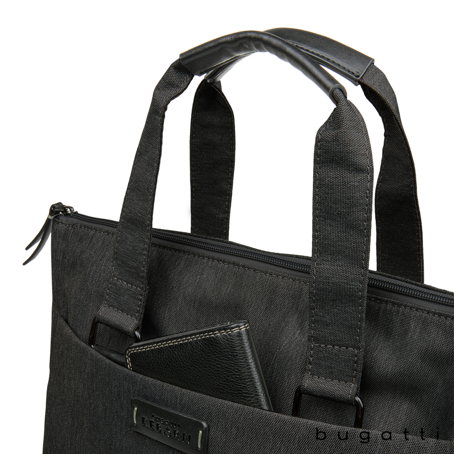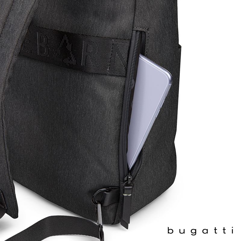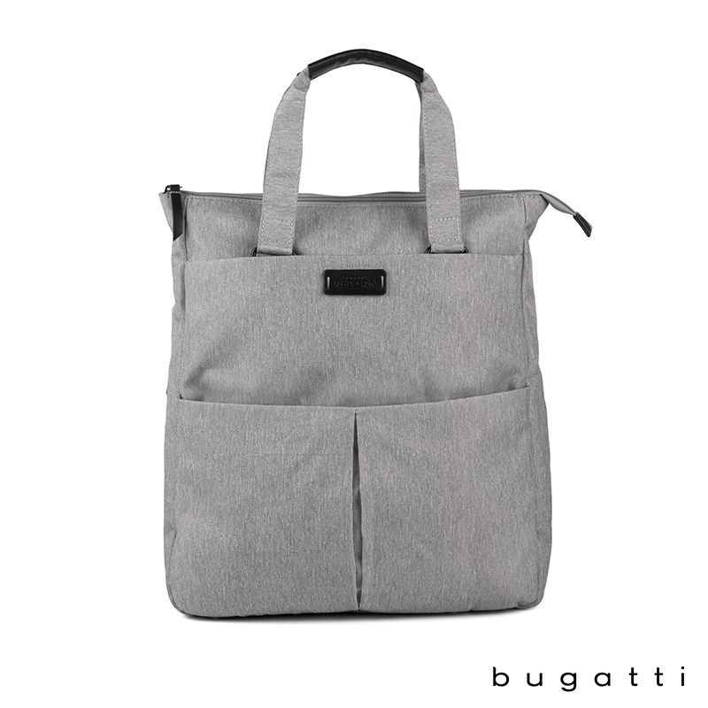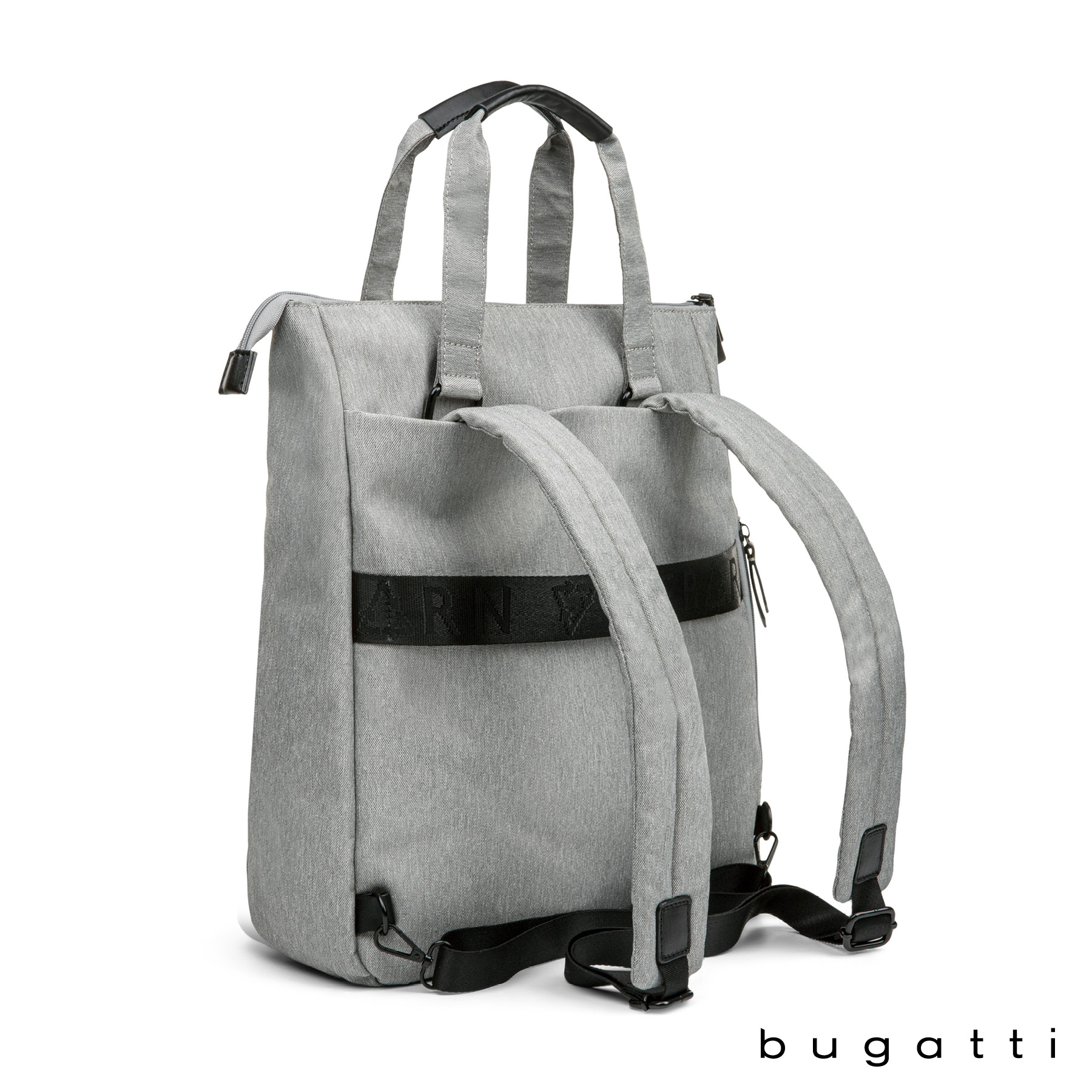 The Reborn Collection Hybrid Tote Bag from Bugatti is made of 100% recycled water-repellent polyester made from post-consumer water bottles (RPET). This lightweight 2-in-1 tote bag has reinforced carry handles and padded back straps that store inside a large backside slip pocket when not in use. It has a main compartment with an interior padded section that can fit most 15.6" laptops, an integrated key leash to easily locate your keys, a padded pocket that fits most tablets, an interior elastic strap to keep your water bottle in place, and an RFID protection pocket to keep your information secure from theft. The Reborn Tote Bag also has multiple exterior pockets and organizer sections, a trolley sleeve to easily slide the bag over your suitcase, and a hideaway zippered side pocket. In addition, this bag includes a one-year limited warranty.