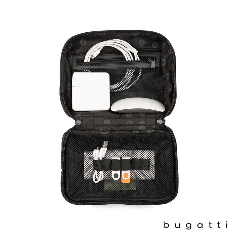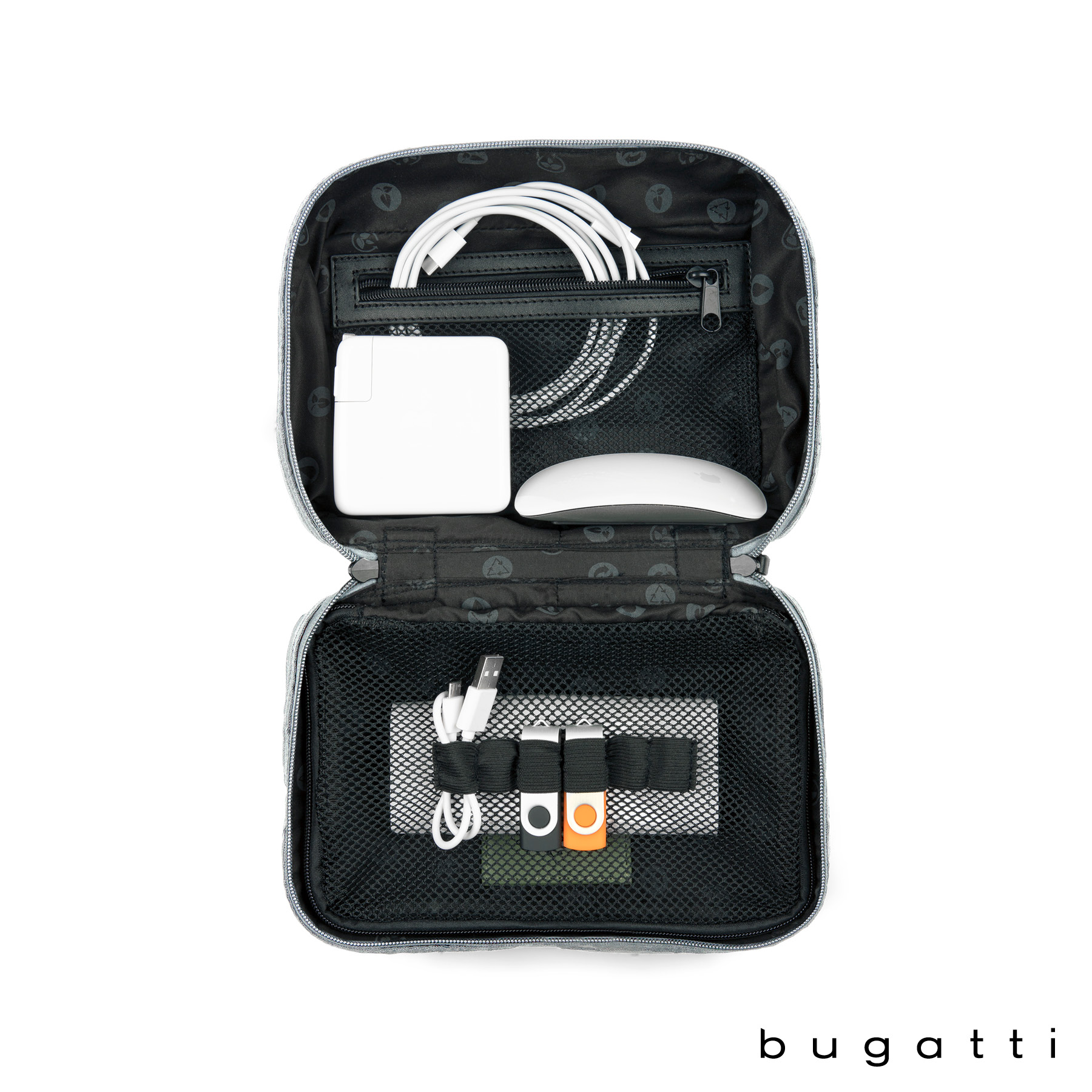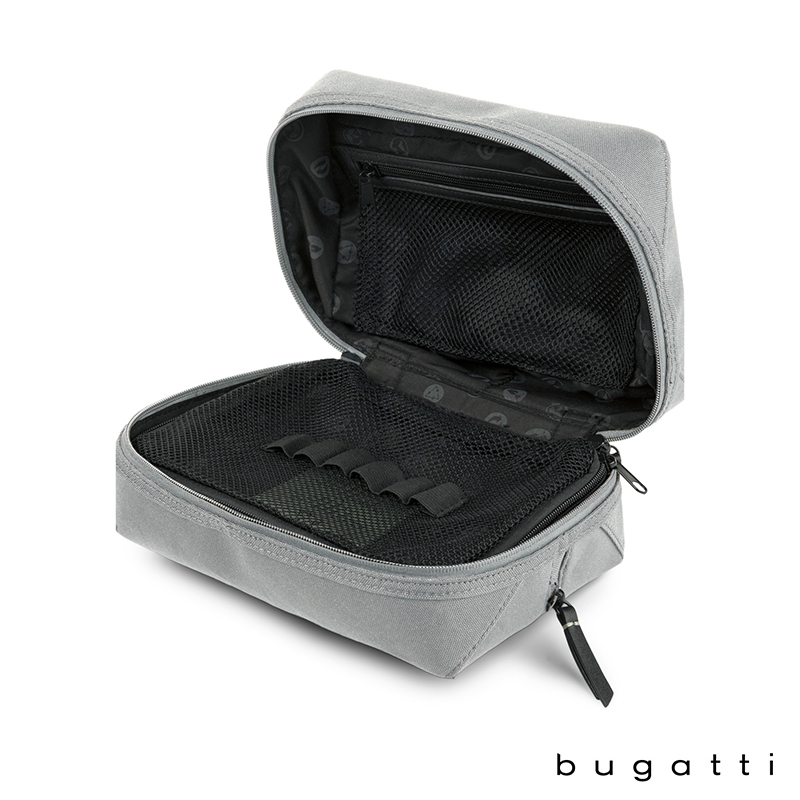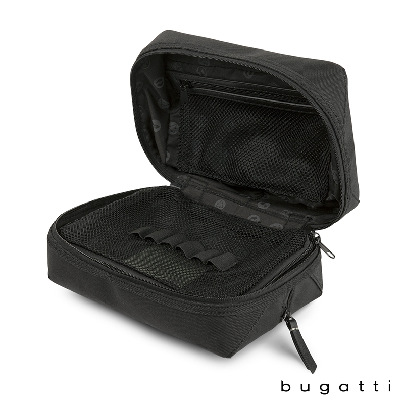 The perfect travel companion to carry your toiletries or tech items, the Reborn Collection Multi-Function Case from Bugatti is made of 100% recycled polyester (RPET). Water-repellant and made from post-consumer water bottles, this easy-to-carry accessory bag has a top handle, a main zippered compartment with mesh zippered interior pockets, a top zippered compartment and a backside zippered pocket. This bag includes a one-year limited warranty.