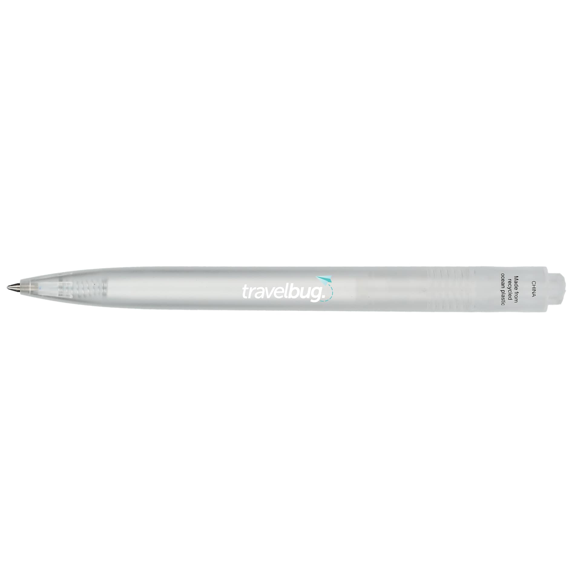 The Recycled Ocean Plastic Gel Pen features a recycled ocean plastic transparent barrel and clip. Includes 0.7mm tip with 300 meters of smooth blue gel ink.