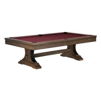The Viking pool table is the latest offering by the C.L. Bailey Company. It features a unique arched style leg with a riveted metal cover. This table comes in a rustic Antique Oak finish. This table has solid one inch framed slates for optimal play. Add a strong, rustic centerpiece to your room with this beautiful Pool Table from C.L. Bailey! Antique Oak finish with green cloth standard. Burgundy, Navy, and Dark Green color cloths available upon request when placing order.