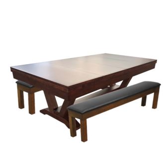 The Skylar Pool Table features clean lines and bold geometric style with a warm finish that grabs your attention and will complete any game room. As with all C.L. Bailey brand tables, the Skylar carries a lifetime guarantee. Warm Chestnut finish with green cloth standard. Traditional Mahogany, Black, Graphite finishes and Burgundy, Navy, and Dark Green color cloths available upon request when placing order. This package includes matching dining top and 2 storage benches.