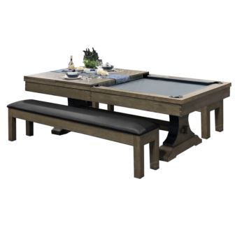 The Viking pool table features a unique arched style leg with a riveted metal cover. This table comes in a rustic Antique Oak finish. This table has solid one inch framed slates for optimal play. Add a strong, rustic centerpiece to your room with this beautiful Pool Table from C.L. Bailey! Antique Oak finish with green cloth standard. Burgundy, Navy, and Dark Green color cloths available upon request when placing order. This package includes matching dinig top and 2 storage benches.