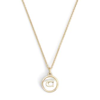 Elevate your style with must-have pendant. This necklace features a mother-of-pearl coin pendant adorned with a sculpted C motif at its center.