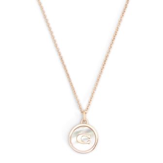 Elevate your style with must-have pendant. This necklace features a mother-of-pearl coin pendant adorned with a sculpted C motif at its center.