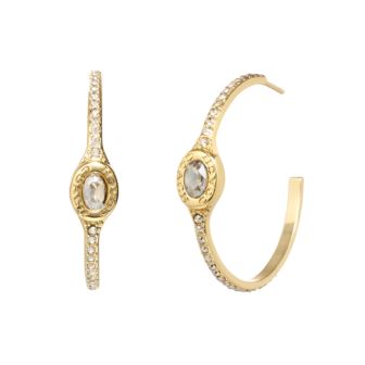 Glistening pavé open hoop earrings featuring sparkly stone at front haloed with signature logo perfect for everyday. Earrings have a post back closure. Handcrafted from polished brass, glass crystal and hypoallergenic sterling silver post.
