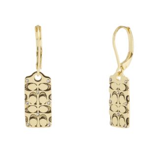 Drop earrings featuring logo tag with quilted signature sculpted C motif adorned with delicate golden crystal stones. Earrings have a lever back closure. Handcrafted from polished brass and glass crystal.