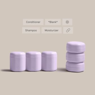 A combination of our best-selling Capsules, the Starter Set includes three Medium Capsules (1.32 fl oz each) and three Small Capsules (0.56 fl oz each) to give you more flexibility on the go. Ideal for longer trips or more specialized routines. This Lavender set comes with magnetic, interchangeable Tiles labeled: Shampoo, Conditioner, Moisturizer, Sun icon, Pill icon, and one Blank. TSA-approved and made with post-consumer materials.