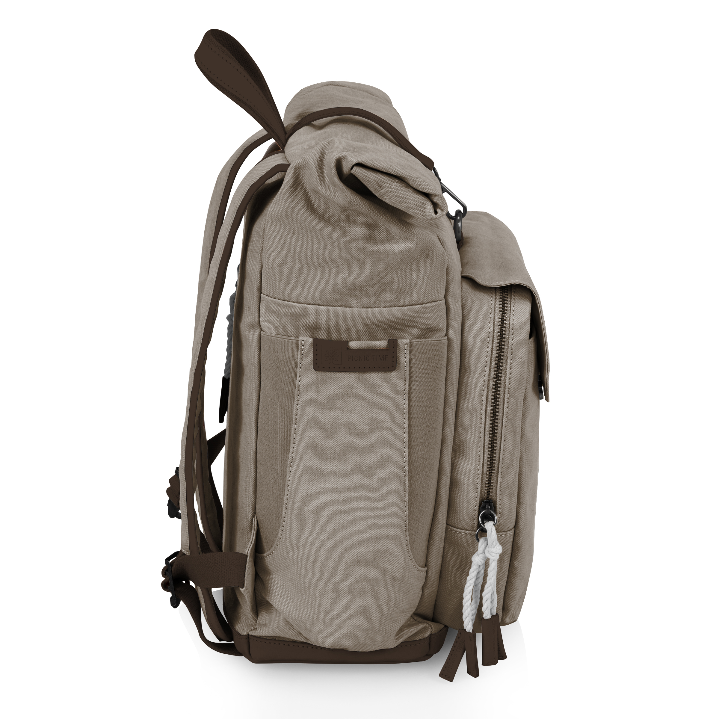 The Carmel Roll Top Picnic Backpack Cooler brings together a certified recycled Cotton canvas exterior with a waterproof, insulated, eco-friendly interior to create one stylish and functional package. But wait - that’s not all! The component pocket in this soft cooler bag can easily store all the picnic accessories you need for a true portable party, the roll top provides even more space for snacks and drinks, and the durable bottom helps keep everything in this outdoor cooler dry. Front slip pocket with key loop Security pocket on back Durable PU bottom Adjustable backpack straps 14.75" L x 6" W x 22" H