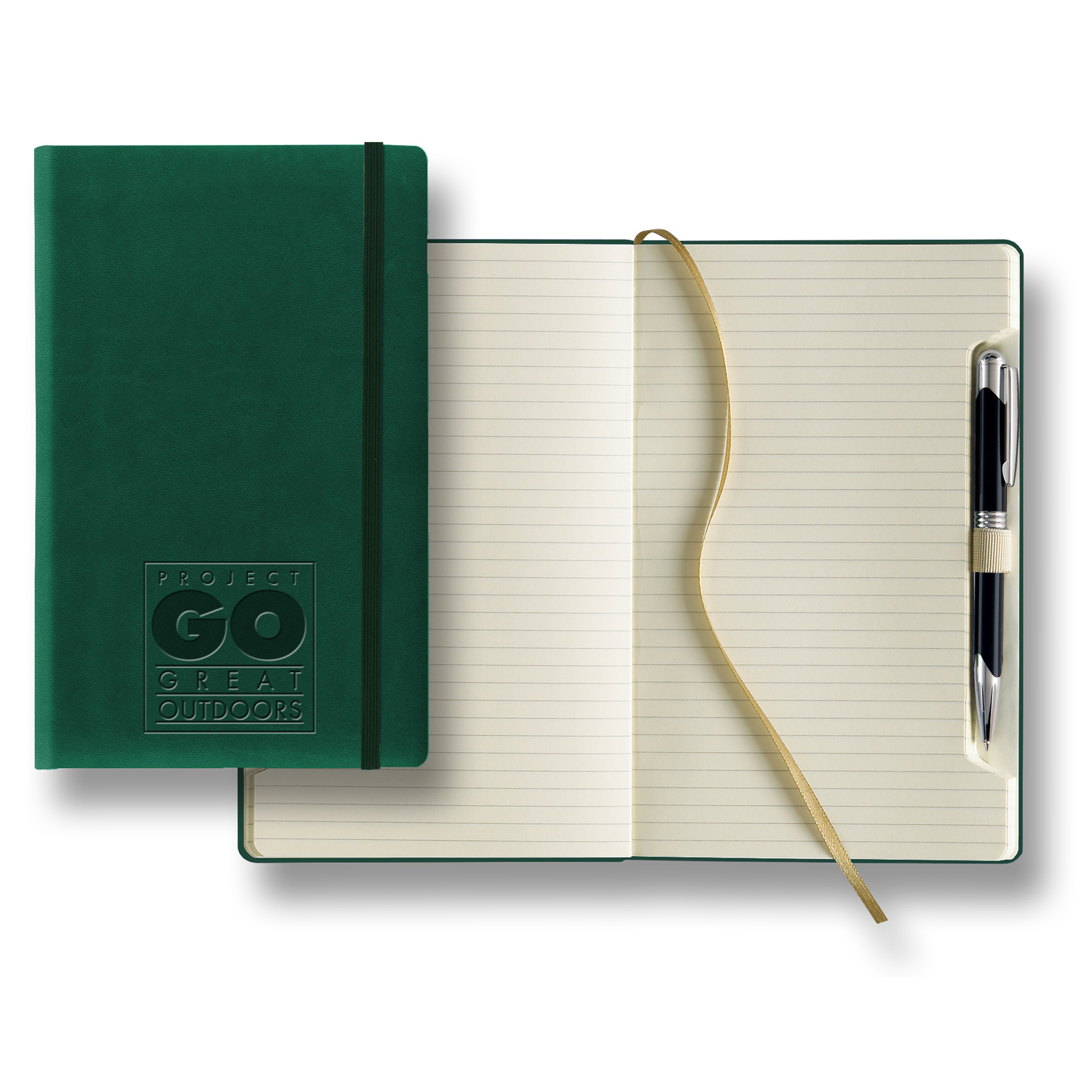 Write down all your thoughts inside the Tucson Medium Scribe Ivory Journal! Measuring 5 1/4" x 8 3/8", journal features a high-grade polyurethane construction that features a smooth surface with a matte finish.  It includes a metal pen in the die-cut lined pages which are printed in gray on 240 tabbed pages of FSC® certified ivory paper. In addition, it contains a gold ribbon marker. Customize the cover with an imprinted company name, logo or message for brand exposure. Great for any promotion!Please specify the pen color: Black, Gunmetal, Blue, Red, or White FSC MIX 70% CQ-COC-000479