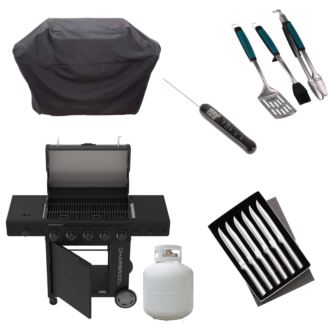 This package keeps you ready for everything from weeknight dinners to weekend parties. It includes: 5-burner grill with 490 sq. in. of cooking space plus a swing-away warming rack, FlavorMax™ technology and an 11,000 BTU side burner; rip-stop 5+ burner grill cover; 3-pc. stainless steel BBQ tool set; insta-read thermometer; 20 lb propane tank; and six Rada Cutlery USA made serrated steak knives made of surgical-grade T420 high-carbon stainless steel for a blade that retains its edge.