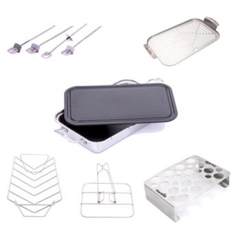 Create delicious food without the mess with the Grill + Accessory System. Compatible with any grill or oven, these stainless steel Grill + accessories can be used independently or together with the Deep Dish for endless meal possibilities. Includes: Deep Dish & Cutting Board; Topper; Pan; Rib & Roaster Rack; Double Pepper Roaster; Folding Beer Can Chicken Roaster and Sliding Skewers (set of 4).