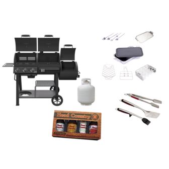 Includes: Oklahoma Joe's® Longhorn Combo Charcoal/Gas Smoker & Grill with separate cooking chambers for high-capacity smoking, charcoal or gas grilling; Grill+ accessories includes: Deep Dish & Cutting Board; Topper; Rib & Roaster Rack; Double Pepper Roaster; Folding Beer Can Chicken Roaster and Sliding Skewers (set of 4); Comfort Grip 3-Piece Tool Set made of stainless steel; and Head Country Gift pack includes: Three 18 oz jars of Bar-B-Q sauce - Original, Hickory Smoke and Hot; 1-6 oz shaker of All Purpose Championship Seasoning. Tank included.
