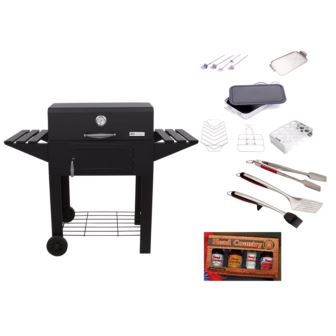 Package includes: BBQ Smoker Grill has porcelain coated cooking grates, side shelves, multiple dampers to easily control heat and smoke, charcoal access door and temperature gauge. Comes with Grill + Accessory System - Deep Dish & Cutting Board; Topper; Rib & Roaster Rack; Double Pepper Roaster; Folding Beer Can Chicken Roaster and Sliding Skewers (set of 4). Also includes a 3-pc BBQ tool set and Head Country Gift pack (3-18oz jars of Bar-B-Q sauce-Original, Hickory Smoke and Hot; one 6oz shaker of All Purpose Championship Seasoning).