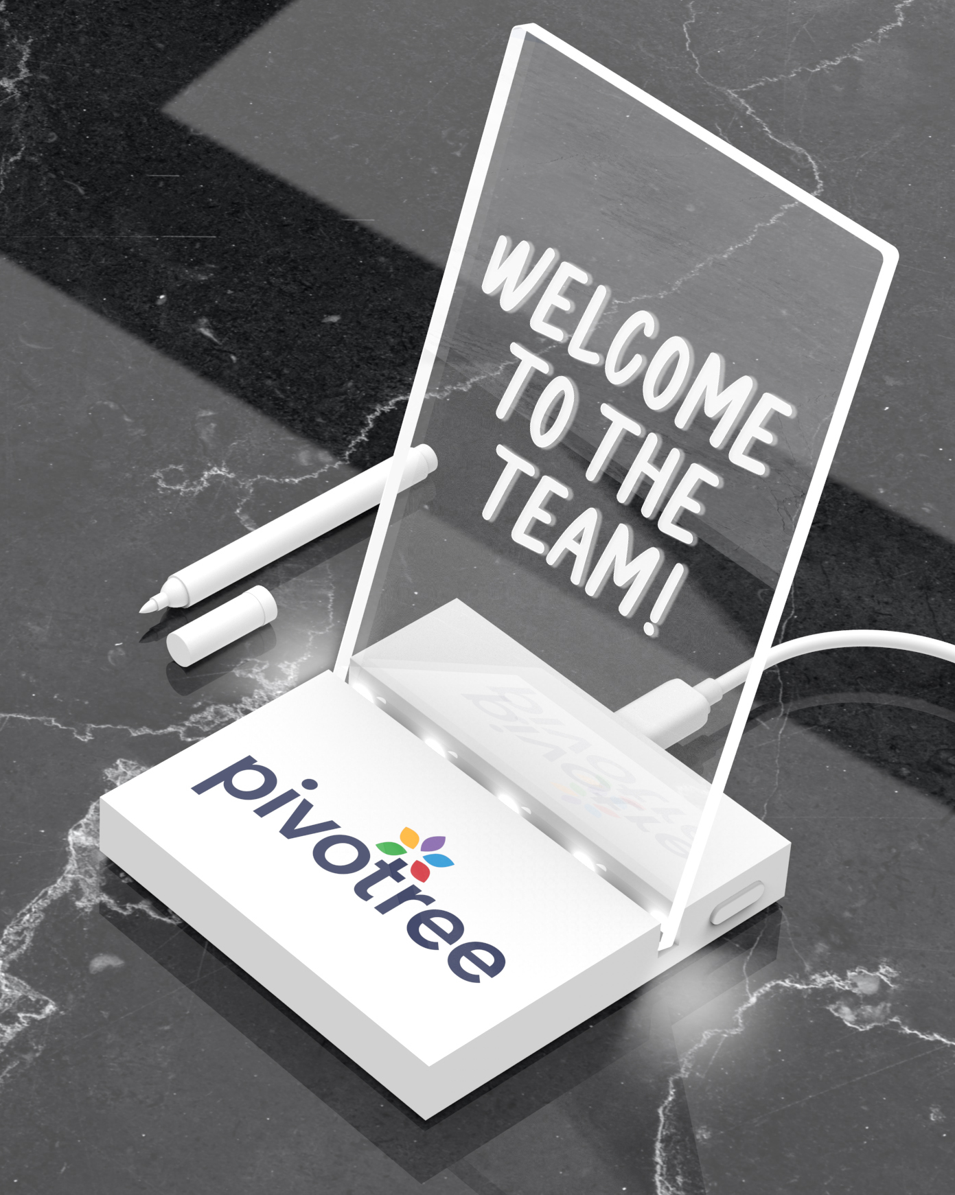 The ClearPad Glow is a trendy light-up memo pad that inspires creativity. Use the supplied chalk marker to make quick notes, doodle or display an inspirational message. Turn on the LED lights and it illuminates the messages creating a fun glow. The chalk marker can be wiped clean with a tissue and endlessly reused. Powered by a USB C to USB A cable. The lights can be powered by any USB power source or wirelessly by the internal battery for about 2 hours (rechargeable). Makes for a sleek desktop item. Great for note-taking, writing daily/weekly tasks or a blank canvas for your imagination. Can be fun to display funny quotes and messages around the office. Minimum order 1 unit. Packaged in a gift box. Part of a give back program: a tree is planted for every order placed.