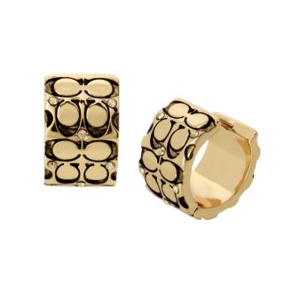 COACH Quilted C Huggie Earrings. Gold-tone wide huggie hoop earrings with engraved signature quilted C's, and embellished with golden shadow crystals. Pierced with click-it closure. Includes COACH gift packaging.