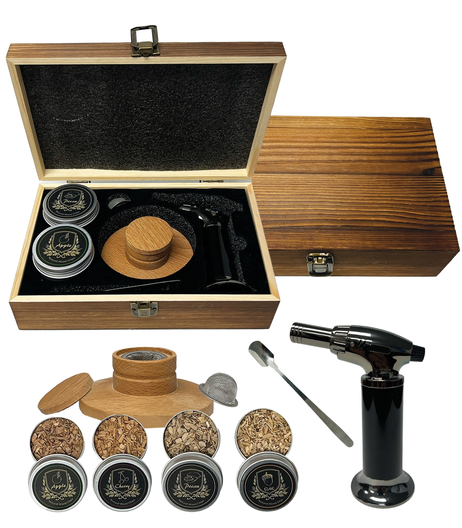 Elevate your cocktail experience with our premium Cocktail Smoker Kit. This all-inclusive set features an Oak Wood Smoker with Lid, a refillable Triple Flame Torch, a spoon, a cleaning brush, two mesh filters, and four distinct wood chip flavors: oak, cherry, pecan, and apple. Perfect for whiskey, bourbon, and even hot chocolate, this kit makes for the ultimate gift. The stylish wood gift box adds an extra layer of sophistication and can be laser engraved with your corporate logo, making it an ideal corporate gift. Using the kit is simple: place the smoker on your glass, add wood chips, ignite with the torch, cover with the lid, and let the smoke infuse your drink. Cheers and enjoy! Please note, the kit does not include butane; you must fill it before the initial use.