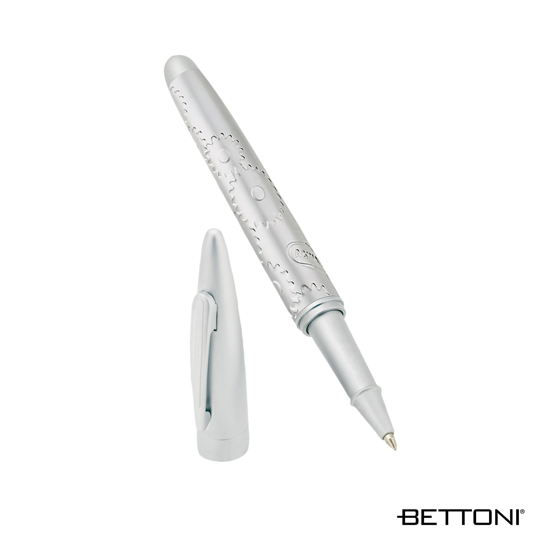 Cap-off rollerball with satin-silver finish, solid brass construction with debossed or embossed designs.
