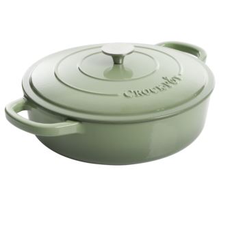 The Crock-Pot Artisan 5-Quart Enameled Cast Iron Braiser Pan in Pistachio Green is perfect for shallow simmering and pan-roasting. With its round shape and wide cooking area, it's great for one-pan meals and browning meats. The enameled coating provides easy food release and fast cleanup, while the soothing pistachio green finish adds charm to your cookware. Packaged in a color sleeve with remailer. Box Dimensions: 15.35" x 15.35" x 7.87"
