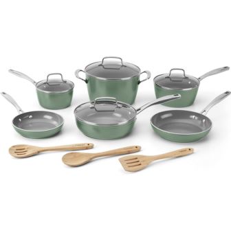 Our exclusive Cuisinart Ceramica XT ceramic nonstick technology is reinforced with titanium for superior release and petroleum, PTFE, PFOA and PFOS free to deliver exceptional performance that all chefs will love! Aluminum core provides even heat and best heat retention. Clear glass covers let you monitor results while cooking. Recycled stainless steel handles allow for a secure, comfortable grip. Packaging is made from recycled cardboard and printed in soy ink. Set consists of: 1.5 Qt. Saucepan w/ Cover, 2.5 Qt. Saucepan w/ Cover, 3 Qt. Saute Pan w/ Cover, 8? Skillet, 10? Skillet, 6 Qt. Stockpot, Bamboo Solid Spoon, Bamboo Slotted Turner, Bamboo Slotted Spoon.