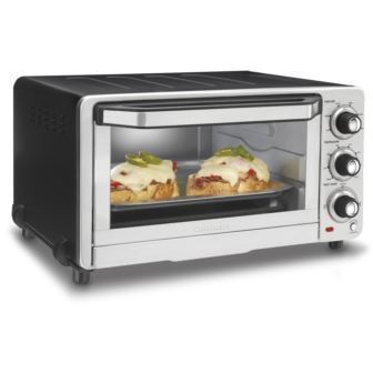 Compact cooking versatility and modern design make this countertop Custom Classic Toaster Oven Broiler an ideal choice for your lifestyle. Brushed stainless and black housing is outfitted with a wire rack, broiling rack and baking/drip pan to handle your tasting, baking, and broiling needs. The nonstick interior and removable front crumb tray are easy to clean. The Always Even Shade Control monitors the toasting temperature and will automatically adjust the timing to produce the desired toast every time; auto slide-out rack means convenient, hands-free loading and removal of foods. The cool touch handle and automatic shutoff means safety is ensured.