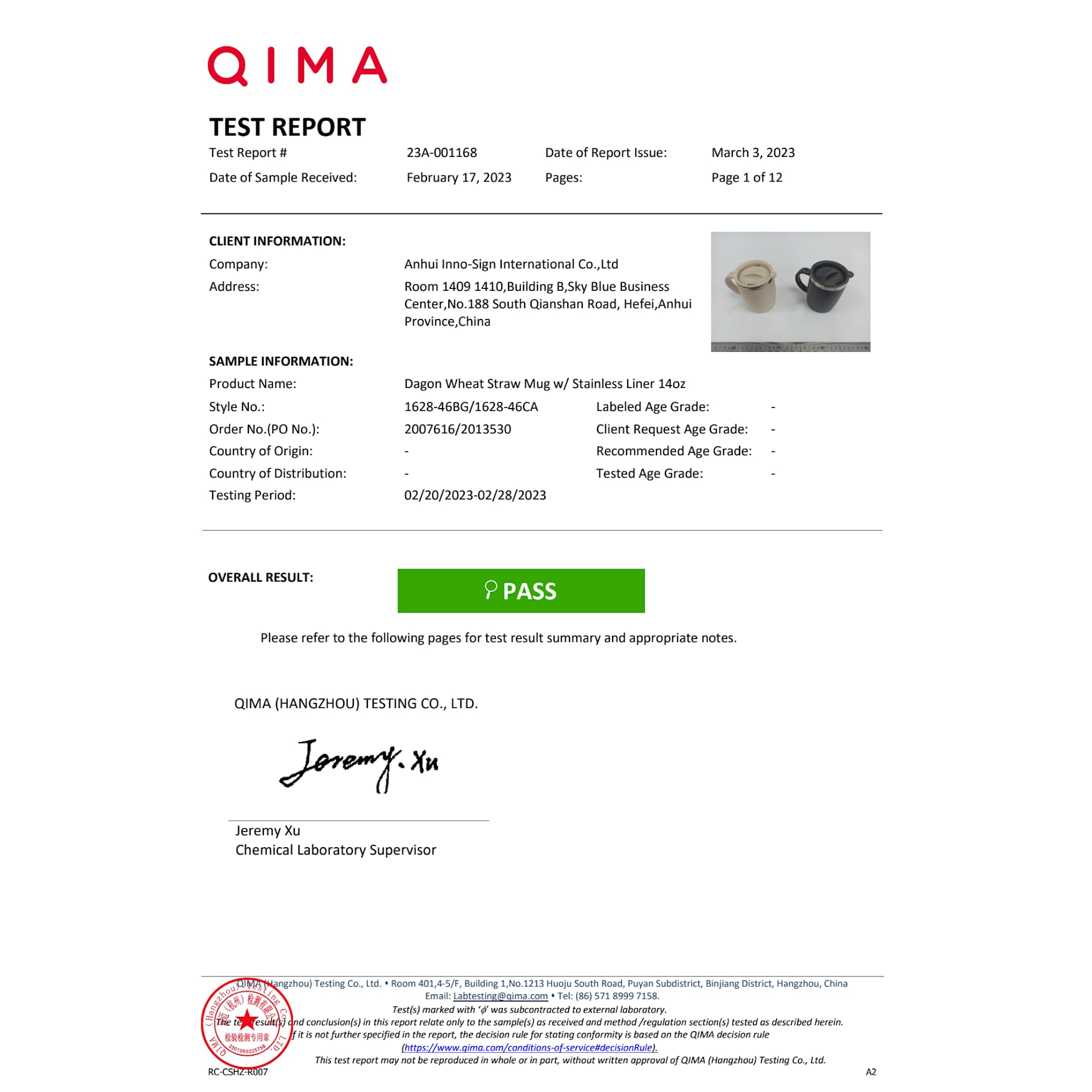 Dagon Wheat Straw Mug w/ Stainless Liner 14oz 1628-46