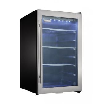 Hosting a get-together is an ideal way to connect with your family and friends - especially with this fashionable beverage center to help fulfill your entertainment needs. This stylish unit is second to none when it comes to keeping your drinks as cool and refreshing as can be. Offering a generous 4.3 cubic feet (123 liters) of cooling and storage space, this cooler can hold up to 124 beverage cans or 88 cans and nine bottles of your favorite wines on three attractive black-wire shelves. Your drinks will be kept cool even when illuminated and smartly showcased by the efficient white LED-lighting system which is designed to produce light not heat. The electronic thermostat allows you to precisely program and maintain the internal temperature anywhere between 4C and 18C (39.2F and 64.4F) so your beverages will be chilled to perfection.