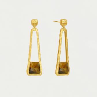 Hand-faceted gemstones hang in sized-down settings that feature a hammered finish inspired by the rocky terrain of the Masai Mara. DD Signature Hammered 22-Karat Gold Finish Over High-Quality Brass. The semi-precious Tiger's Eye gemstones are rare, ethically sourced and hand cut from naturally occurring materials, giving each individual stone its own unique color.