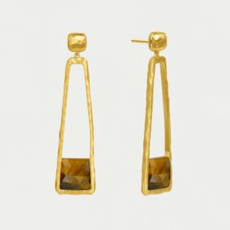 Make a safari-chic statement with square gemstones suspended in artfully hand-hammered gold settings. Hand-faceted gemstones hang a setting that features a hammered finish. DD Signature Hammered 22-Karat Gold Finish Over High-Quality Brass. The semi-precious Tiger's Eye gemstones are rare, ethically sourced and hand cut from naturally occurring materials, giving each individual stone its own unique color.