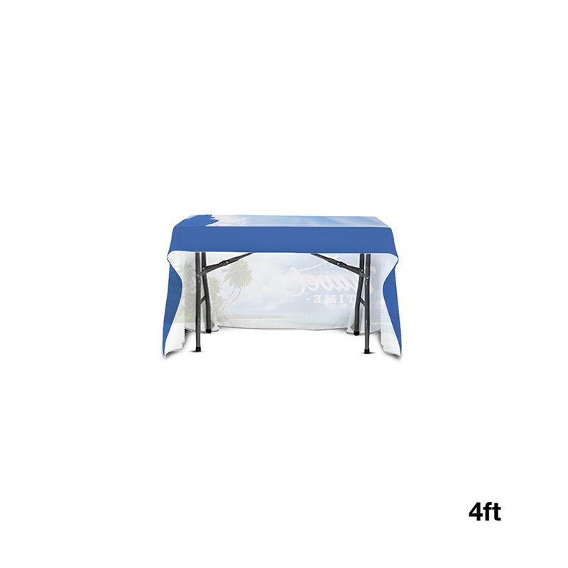 The 4’ DisplaySplash Open Back Table Throw is ideal for trade shows, product launches, exhibitions and presentations. Draw customers and get your message across with full color dye sublimation that creates a stunning image and strong representation of your brand. This table throw is sized for a 4’ table with dimensions 48” x 30” x 29”; it covers 3 sides of the table and leaves the back open for you to rest your legs and easily access items underneath your table. It is easy to take care of as it’s made of 300D polyester, is wrinkle-resistant and fire-retardant treated, machine washable and ironable. Carry this table cloth in its PVC zippered carrying bag. EQP does not apply on DisplaySplash orders.
