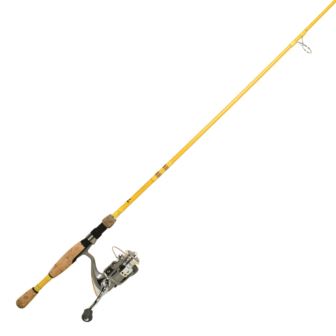 Ultra light power 6' fiberglass spinning rod with moderate fast action has a cork handle to provide comfort and a secure grip. Rod comes in 2 sections with 5 aluminum oxide guides plus tip and is paired with a size 10, 6 ball bearing spinning reel.