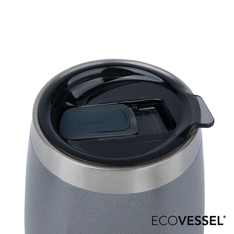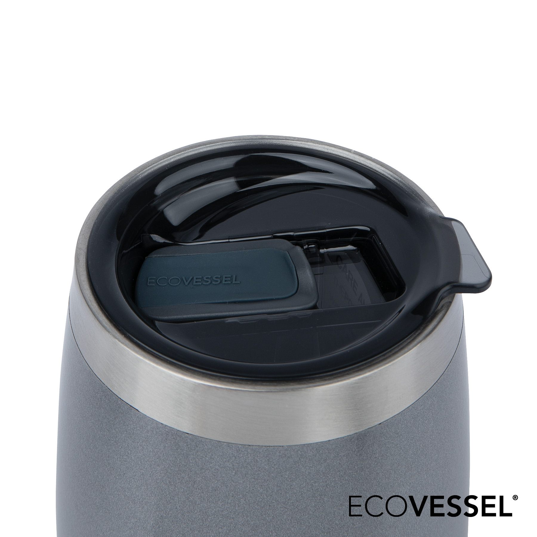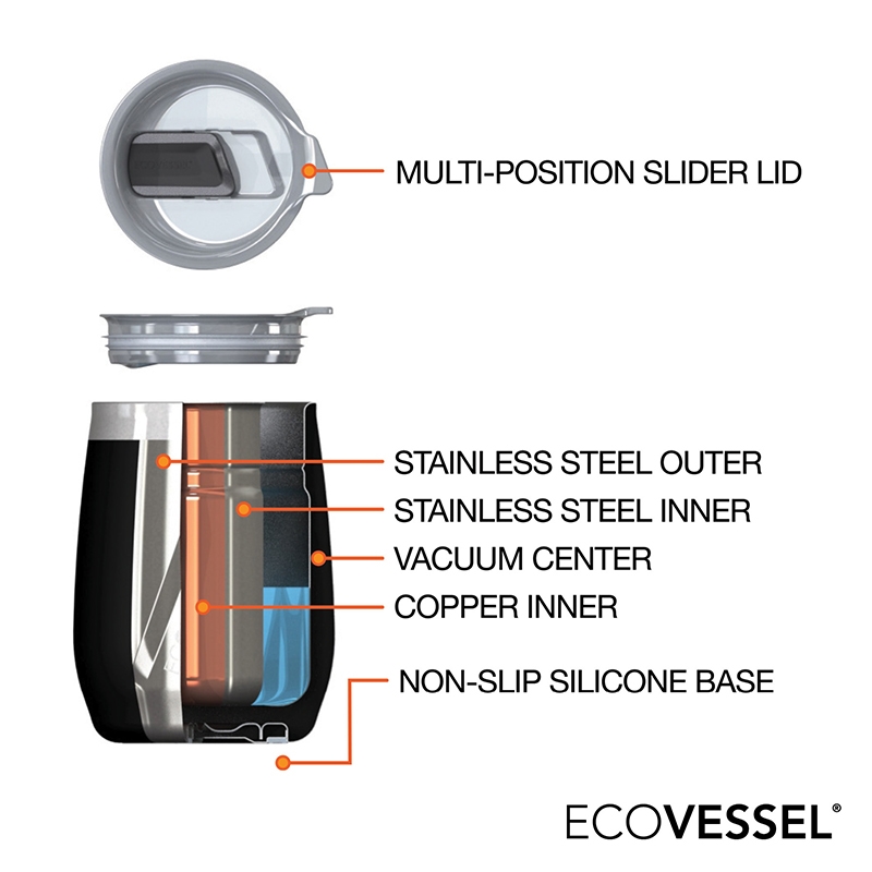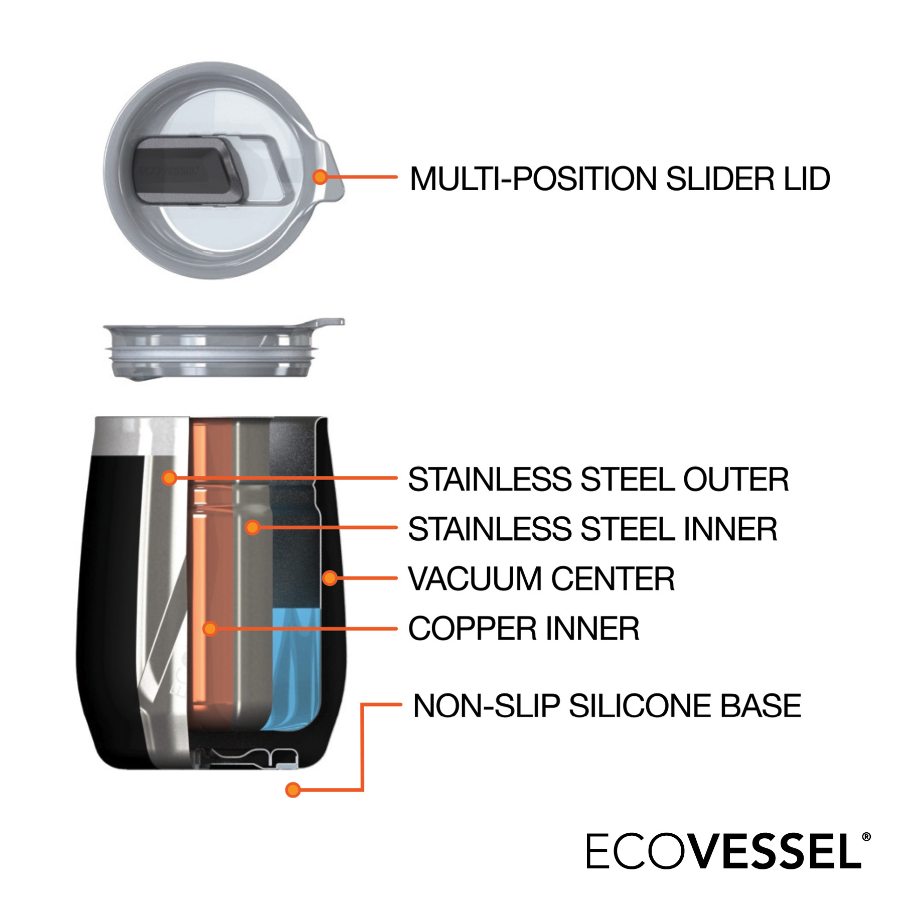 Take your favorite wine, whiskey, or cocktail on the go with EcoVessel® Port 18/8 Stainless Steel 10 oz. Tumbler. The seamless tumbler features double wall vacuum insulated construction with copper lining to maintain the temperature of any drink for hours and is an elegant and functional alternative to traditional cocktail and wine glasses. It features a push-in slider lid to keep your favorite drink safe and clean and the bottom silicone ring provides soft landings and protects tabletops. Take the Port Tumbler insulated wine cup on your wine tasting adventures or simply enjoy it while relaxing at home. Through their partnership with 1% for the Planet, EcoVessel donates a minimum of 1% of all sales to various environmental nonprofits. FDA compliant and BPA Free.