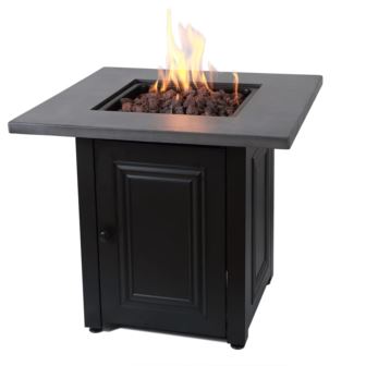Add a stylishly refined element to your outdoor entertaining space with The Wakefield, a 28-Inch square fire pit, by Fire Island. Gather friends and family around to enjoy conversation and warmth by a fire powered by 50,000 BTUs, or food & drink as you use the steel table insert to transform it into a sleek tabletop. Made of a stamped steel, black base and a grey, concrete like mantel top, the fire pit comes with Lava Rock that provides an elegant look for your backyard. Standard propane tank not included.