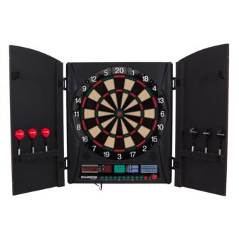 Maurader 5.0 Electronic Dartboard Cabinet Set features 9 colorful backlit scoring windows with a large sized footprint. The integrated wood door cabinet doors make it a perfect fit for the game room. With 4 dedicated X/O scoring displays, 38 games and 167 level variations, this set is perfect for any party, or use the solo play and heckler features to spice up your practice time.