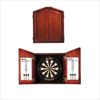 Attractive and durable, the Accudart Union Jack dartboard cabinet set is an excellent choice for your game room. This cabinet features a solid wood design and profiled doors. Keep everything within reach with the built-in dart storage and double dry erase scoreboards and marker. Includes the Classic Competition Quality Bristle Dartboard, (6) Brass Darts, and Play Darts...Easy as 1, 2, 3 brochure.