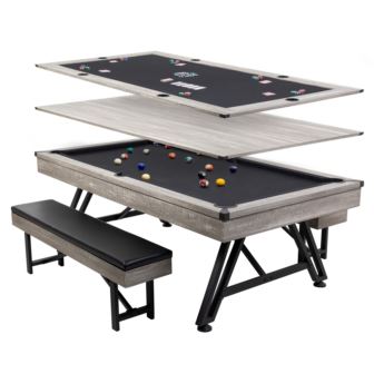 The American Legend 3-in-1 Combo Table brings billiards, poker, and dining together in one sleek design. Easily switch from meals to game night by flipping or removing the dining top. With all accessories included, modern distressed grey oak finish, black felt surface, and steel legs, it's built for style and durability. Two upholstered flip-top benches provide comfortable seating, hidden storage, and a perfect match for this versatile entertainment centerpiece.