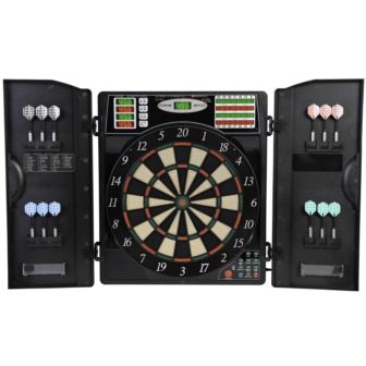 The Arachnid Titanium 5400 Electronic Dartboard and Cabinet Set is packed with features. This durable electronic dartboard is mounted in a contemporary-style cabinet and its 13.5" target area offers 38 different games and 183 variations. Play with up to seven of your friends with four-player X/O Led score display and active score window. To round out the set, the Arachnid Titanium 5400 Electronic Dartboard and Cabinet includes six soft tip darts, extra tips and AC adapter.