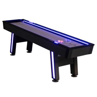 The Atomic 9-foot LED Shuffleboard Table brings modern style and classic fun to your game room. Featuring sleek graphite construction with black carpet and bright LED accents along the rails and legs, it creates a striking look. Play traditional shuffleboard or switch to the bonus bowling game with included pins, setter, and surround. Eight chrome pucks and shuffleboard powder ensure smooth play, while an AC adapter powers the lighting. Two games, one stylish, durable table.