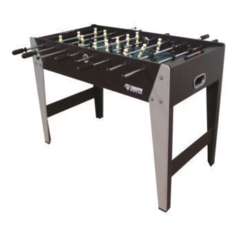 Fast-paced soccer on a solid, stylish table! This 48" table brings the action and excitement of foosball to your home. The table's eight rods feature ergonomic grips for comfortable use while you battle it out with your friends and family. When a goal is scored, the ball return gets the ball back to you so the game can continue. Easily keep track of score by using the manual scorers on each side of the table. Leg levelers are included to ensure a consistent level playing field. Be the envy of your friends with this fun and attractive soccer game!